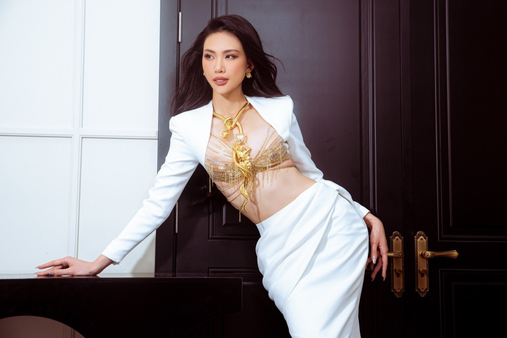 Đây là mẫu váy dạ hội của nhà thiết kế Lành Thơ, thương hiệu Lasapri. Thiết kế cut-out táo bạo, với phần cúp ngực được đính kết cầu kỳ, kèm theo chiếc vòng cổ hình nữ thần rắn mạ vàng đồng.