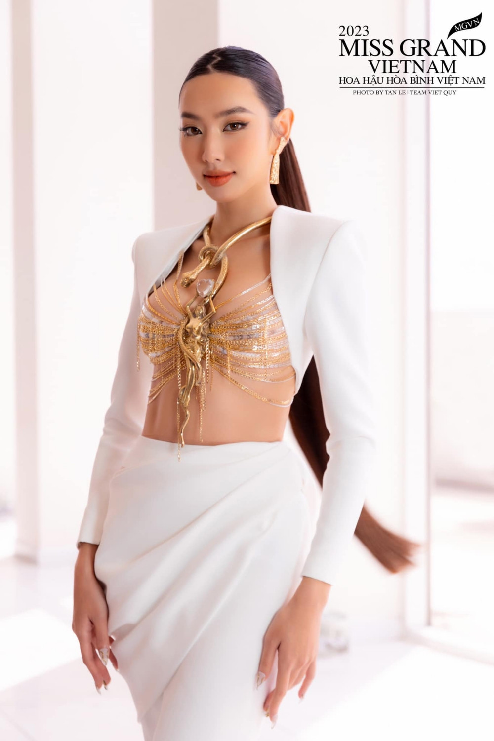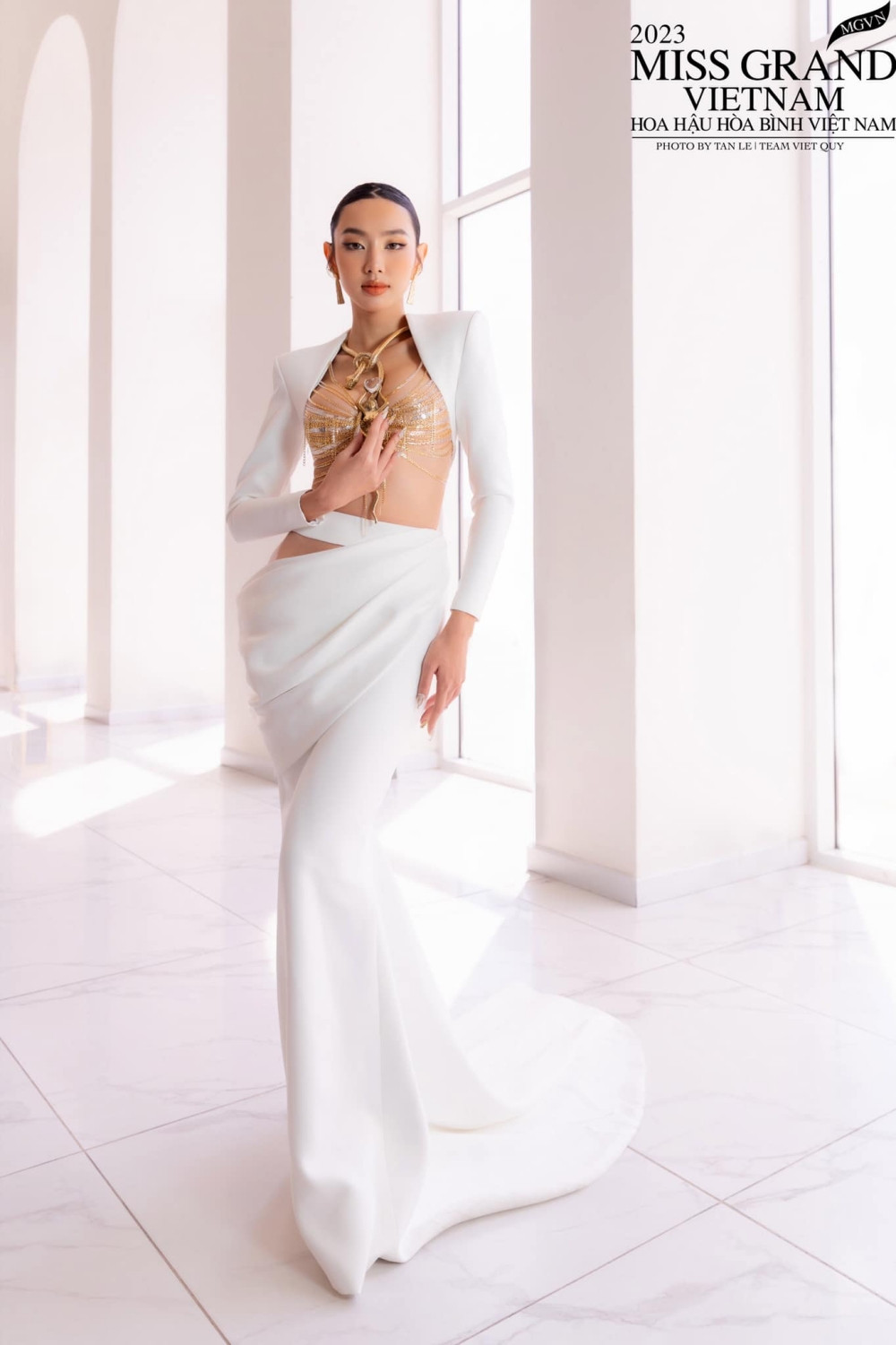 Miss Grand International 2021 Nguyễn Thúc Thùy Tiên mặc thiết kế này trong buổi họp báo giới thiệu vương miện của cuộc thi Miss Grand Vietnam 2023.