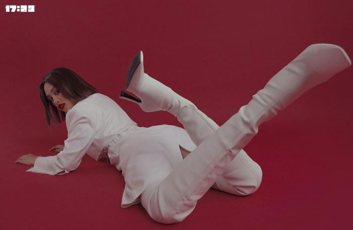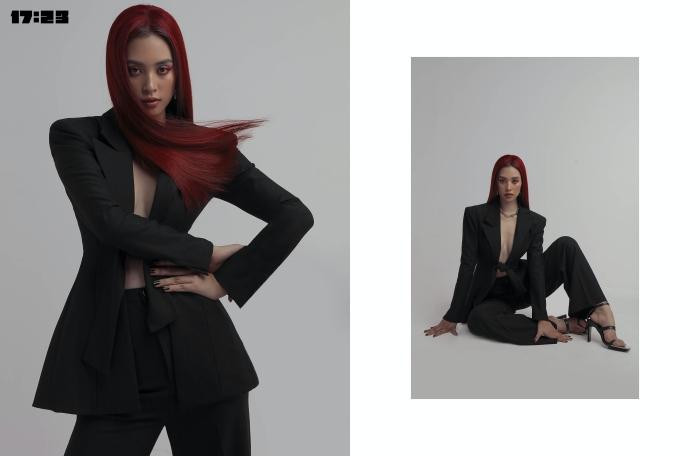 Cô mặc bộ suit phong cách menswear no bra, tóc đỏ ma mị, các bộ trang phục mang hai màu chủ đạo đen và trắng - hai sắc thái kinh điển biểu trưng cho sự thanh thoát, quyến rũ.