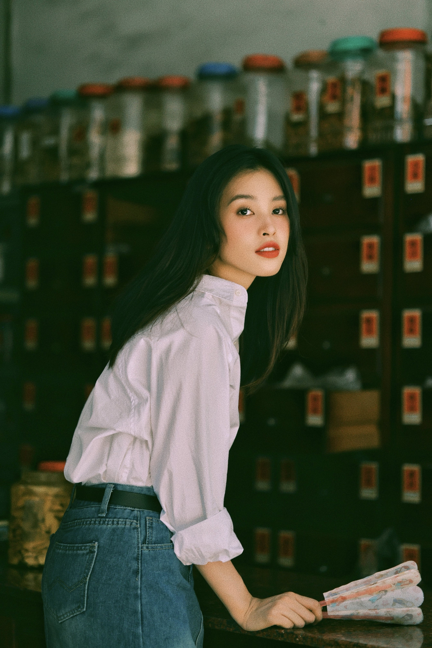 Với bộ ảnh lần này, ‘nàng Hậu’ chọn phối chiếc áo sơ mi cùng chiếc váy jean vintage, điểm xuyết thắt lưng đen và đôi giày loafer cổ điển. Bên cạnh đó, người đẹp còn chọn lối makeup trong veo, tối giản chỉ nhấn đậm vào đôi môi đỏ đặc trưng.
