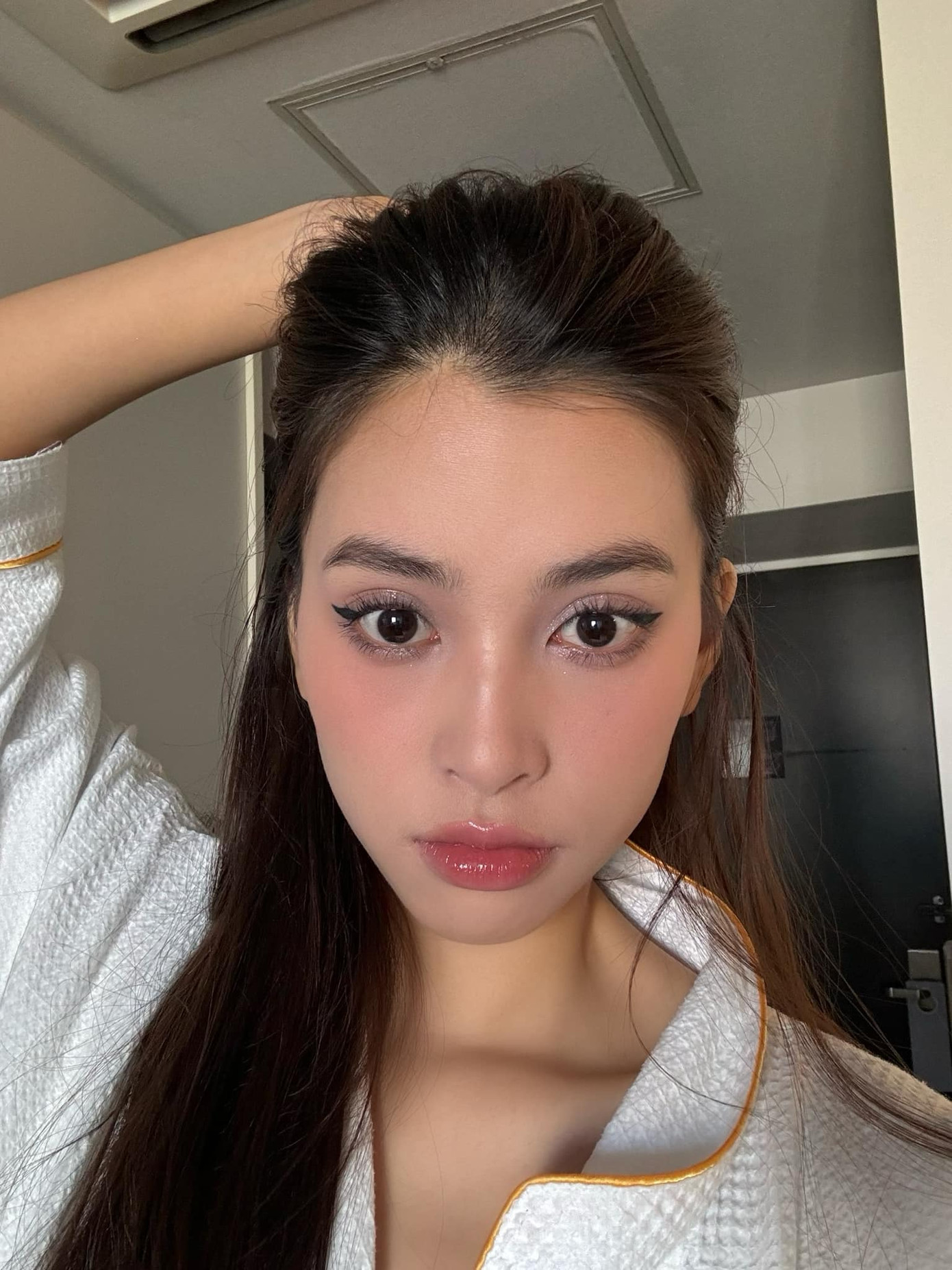 Quan sát kỹ, netizen phát hiện quầng mắt của nàng hậu hơi thâm, có lẽ do cô bị mất ngủ. Nhưng nhược điểm này vẫn không làm giảm độ xinh đẹp của Tiểu Vy và có thể dễ dàng giấu đi bằng một vài mẹo trang điểm.