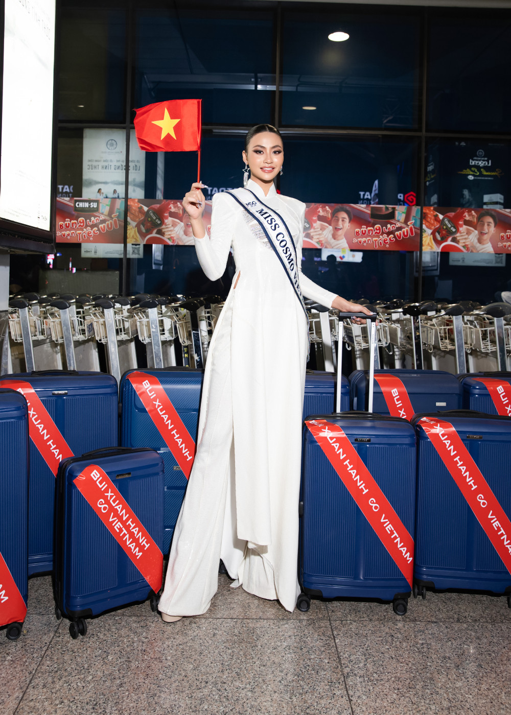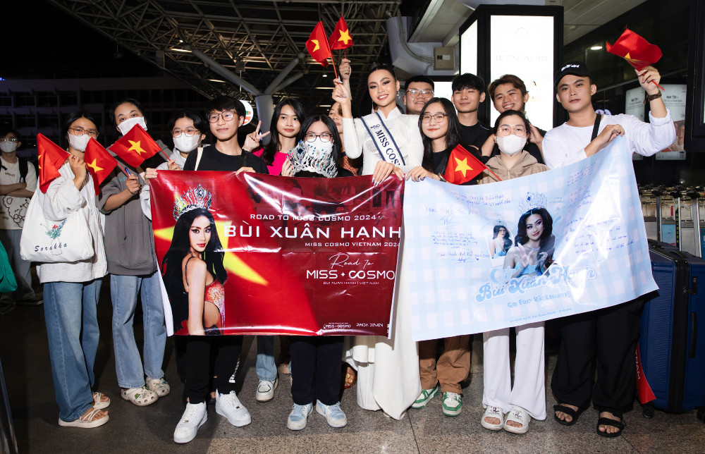 Đến tiễn Xuân Hạnh còn có các khán giả hâm mộ - những người luôn theo dõi, cổ vũ và ủng hộ người đẹp từ những ngày thi Hoa hậu Hoàn vũ Việt Nam (Miss Cosmo Vietnam) 2023. Xuân Hạnh và các fan đã cùng nhau hô vang hai tiếng Việt Nam đầy tự hào và quyết tâm trước khi lên máy bay đến Hà Nội.