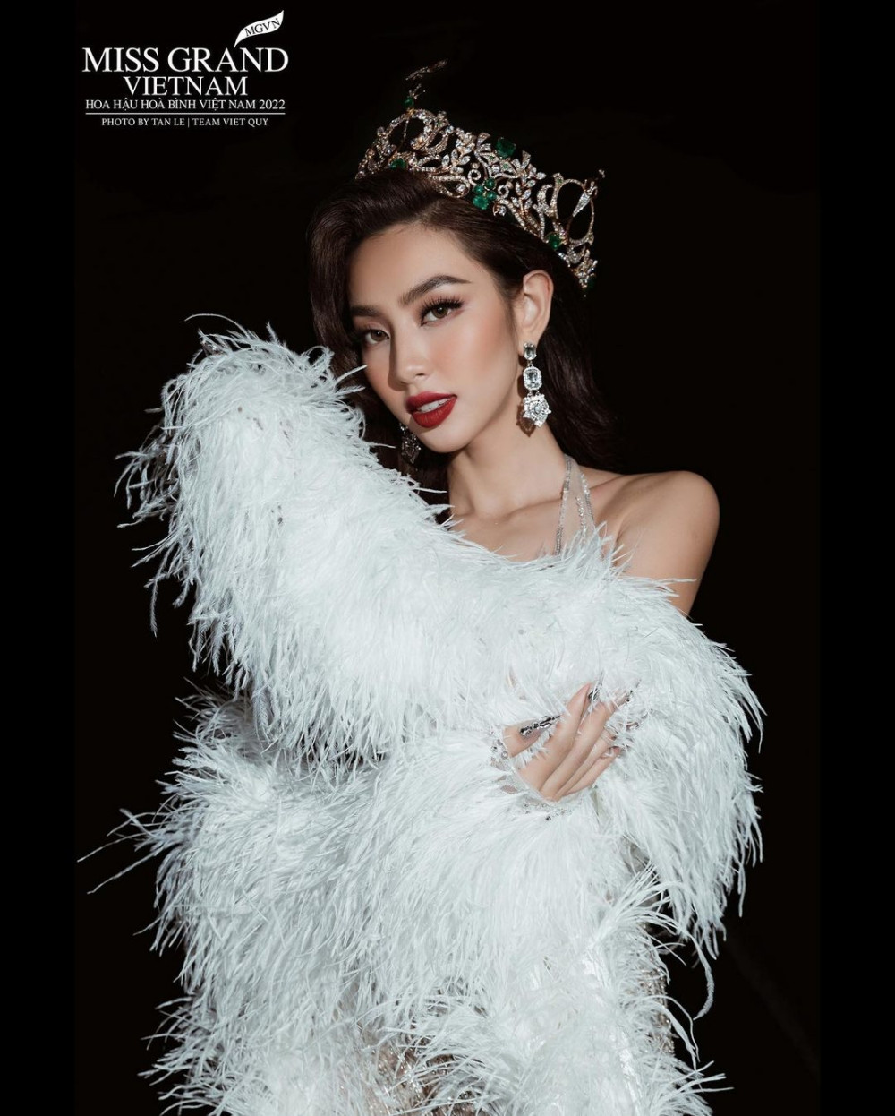 Thùy Tiên đội vương miện, sử dụng khăn choàng lông dài, đánh son đỏ và tóc xoăn bồng bềnh, mang đậm thần thái của một beauty queen.