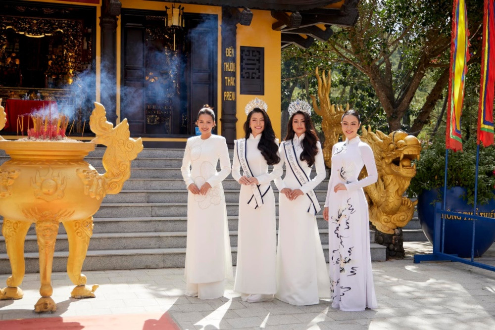Ngày đầu tiên sau đăng quang, Hoa hậu Xuân Hạnh diện áo dài trắng đi lễ chùa cùng Á hậu Hoàng Thị Nhung, Hoa hậu Ngọc Châu và Á hậu Thủy Tiên, cả 4 người đẹp đều diện áo dài trắng nền nã.