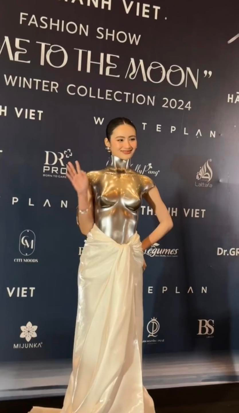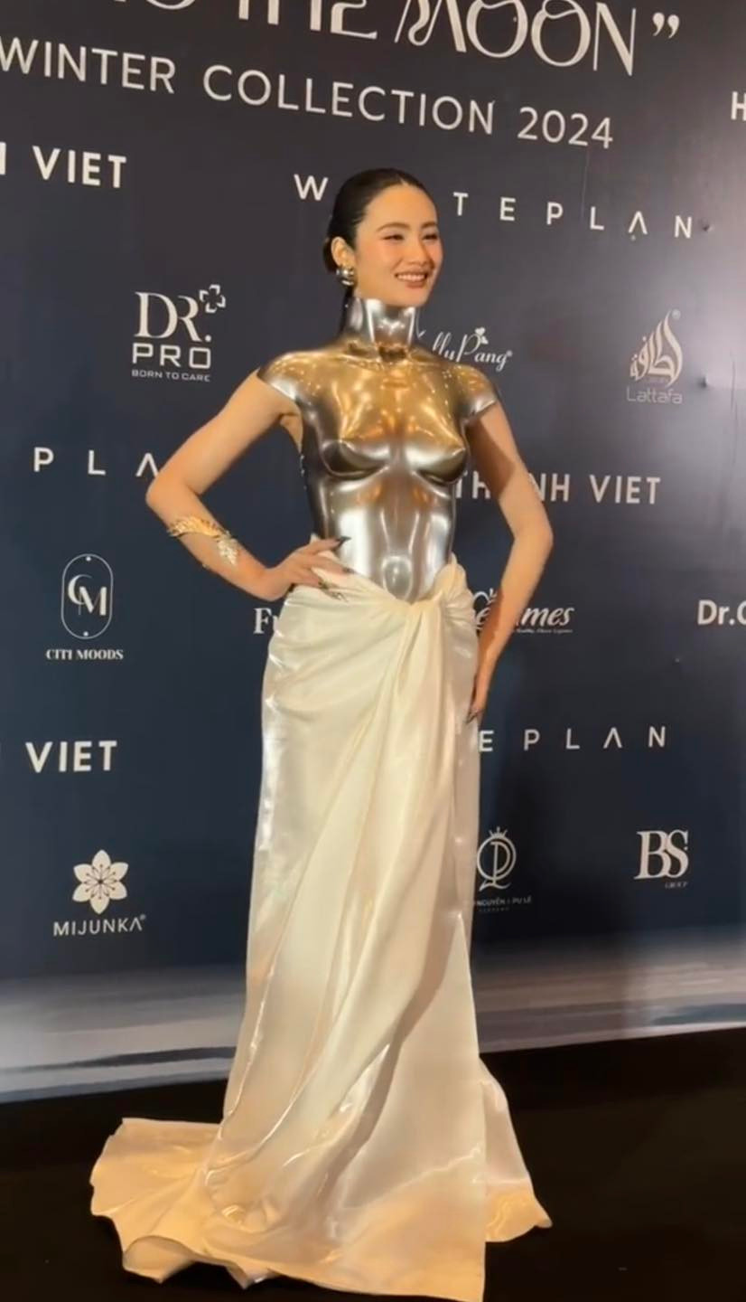 Miss World Vietnam 2023 mặc một bộ váy dạ hội với thân trên đúc nguyên khối màu ánh kim kết hợp chân váy trắng mềm mại. Thiết kế mang phong cách vị lai rất lạ mắt, phần thân áo được mô phỏng cơ thể người mặc trông như một tác phẩm điêu khắc, tuy nhiên chính điểm độc đáo này đã gây tranh cãi.