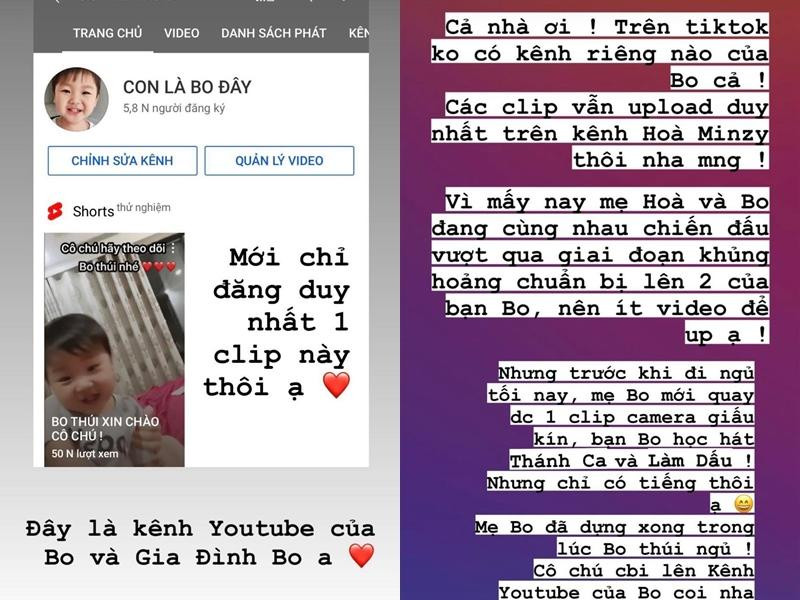 Hòa Minzy trước đó cho biết cô muốn chia sẻ nhiều hơn những khoảnh khắc thường ngày của con trai lên mạng xã hội nhưng vì liên tục bị người khác đăng tải lại và chỉnh sửa video nên cô cũng hạn chế hơn. Kênh YouTube "Con Là Bo Đây" Hòa Minzy lập cho con trai vừa cán mốc 12.000 người đăng ký sau chưa đầy 24 giờ.