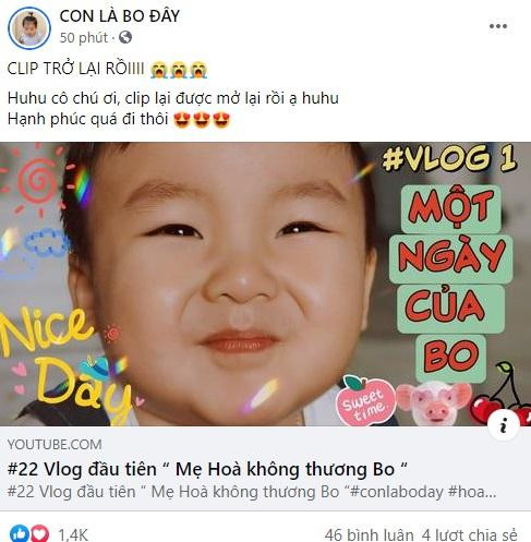 Ngoài thông tin vlog đầu tiên của con trai đã được YouTube mở lại, Hòa Minzy còn thông báo fanpage Con Là Bo Đây được lập riêng cho con trai đã chạm mốc 1 triệu lượt theo dõi chỉ sau 2 tháng.