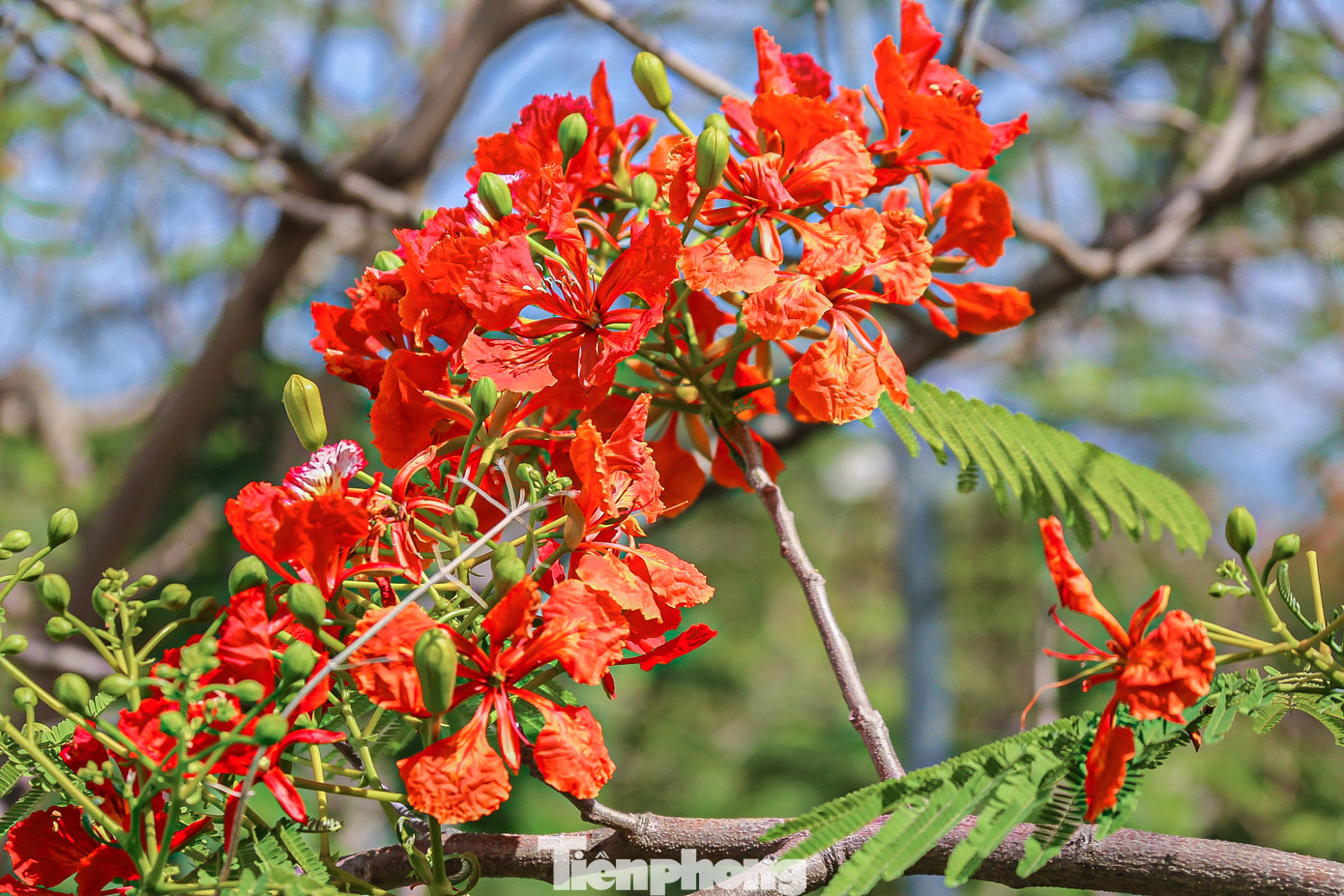 | Hàng nghìn bông hoa phượng kết thành từng chùm, nhuộm đỏ các con đường, ngõ phố ở Đà Nẵng. |