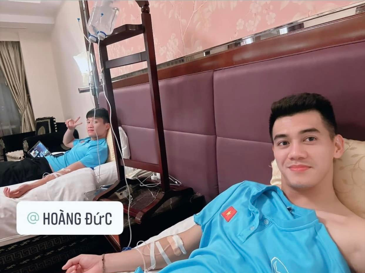 Hoàng Đức và Tiến Linh có dấu hiệu mệt mỏi sau hành trình dài và phải truyền nước. Nhưng theo hình ảnh được Tiến Linh đăng tải, cả anh và Hoàng Đức đều vui vẻ.