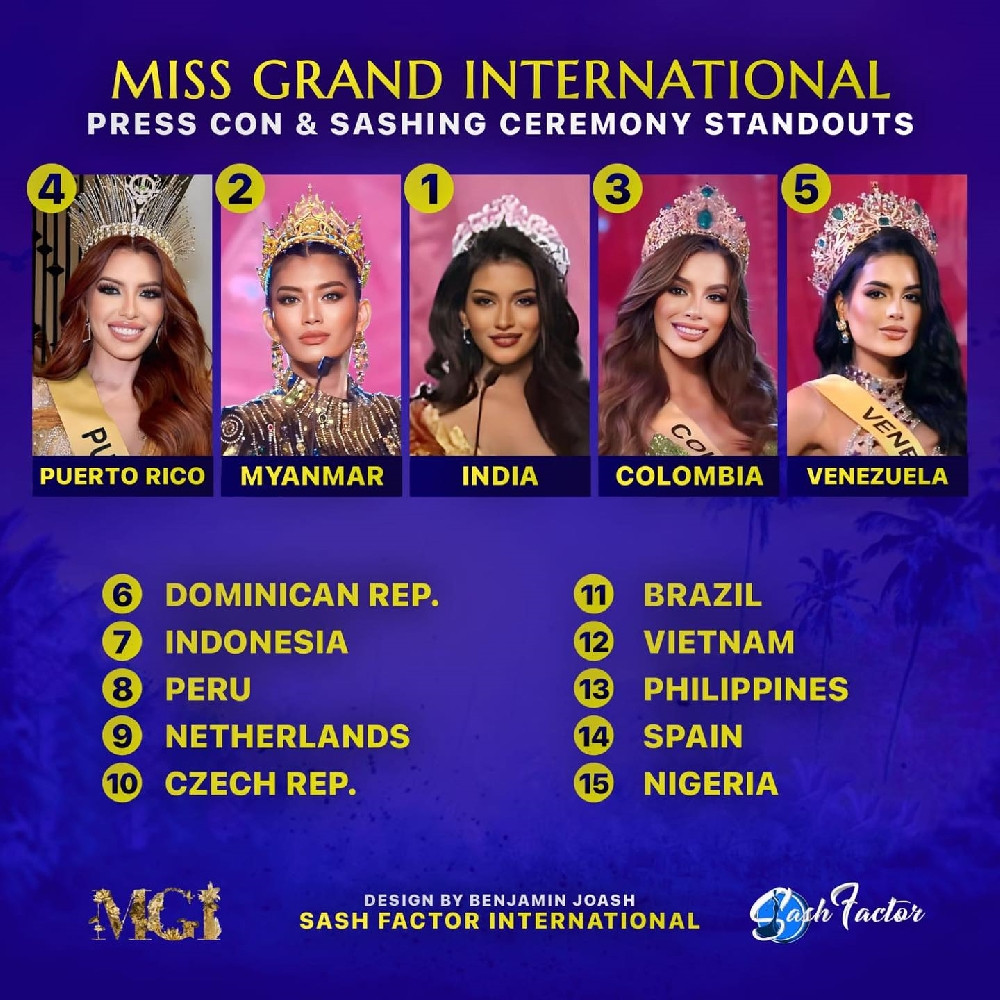 BXH về sự thể hiện của dàn thí sinh sau những ngày đầu nhập cuộc Miss Grand International 2023, Hoàng Phương được xếp thứ 9.