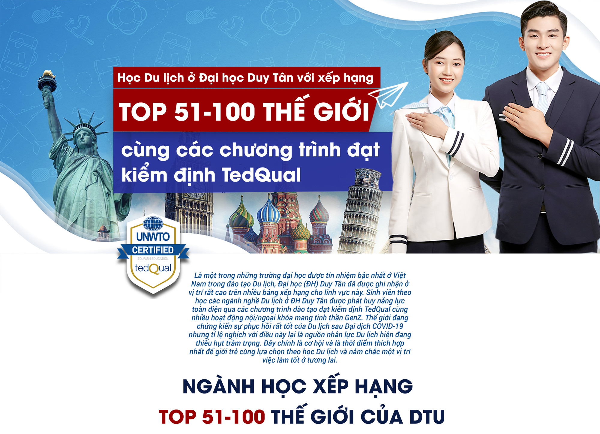 Sinh viên học Du lịch tại ĐH Duy Tân nhiều năm qua đã được “tận hưởng” chất lượng cao trong đào tạo ở khối ngành này bởi hầu hết các chương trình đào tạo đều “nhập khẩu” từ ĐH Bang Pennsylvania, 1 trong 50 trường đào tạo Kinh tế - Quản trị kinh doanh hàng đầu của Mỹ (theo U.S. News 2023) và 1 trong 5 trường đào tạo Du lịch hàng đầu thế giới (theo UNWTO), bao gồm: