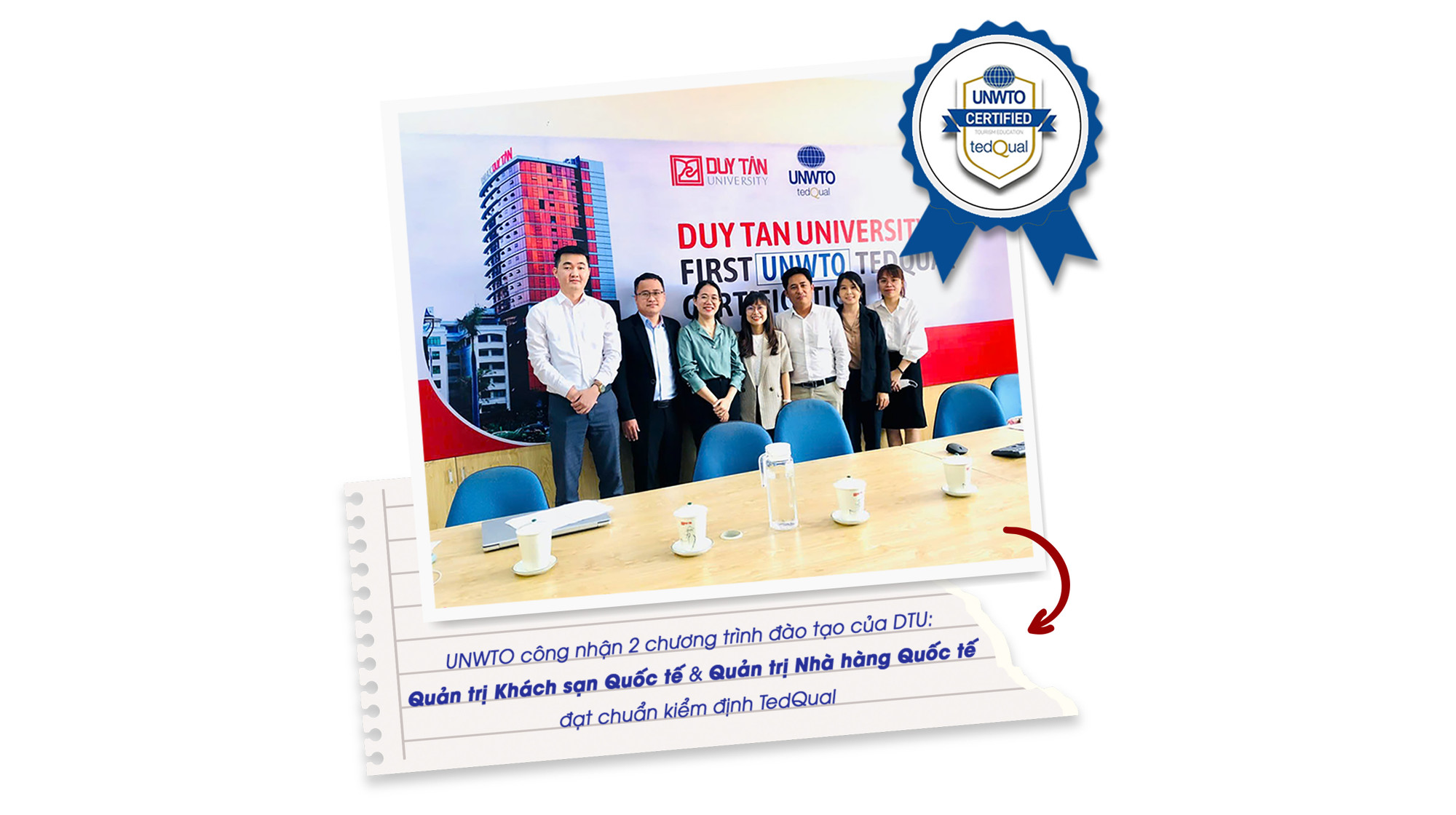 Hơn thế nữa, một chứng nhận đảm bảo chất lượng đào tạo Du lịch ở ĐH Duy Tân đã được ghi nhận khi Tổ chức Du lịch thế giới (của Liên Hiệp Quốc) - UNWTO vào ngày 8/7/2022 đã công nhận 2 chương trình đào tạo: