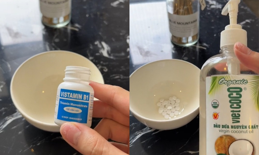 Nàng hậu dùng 10 viên vitamin B1 (có thể mua ở các hiệu thuốc) nghiền thành bột rồi trộn cùng dầu dừa, nước lọc và khuấy đều trong bát cho đến khi chúng tan hết. Sau đó Đỗ Thị Hà dùng cọ trang điểm thoa đều hỗn hợp này lên chân tóc rồi quấn khăn/ trùm mũ tắm để ủ trong khoảng 30 phút.