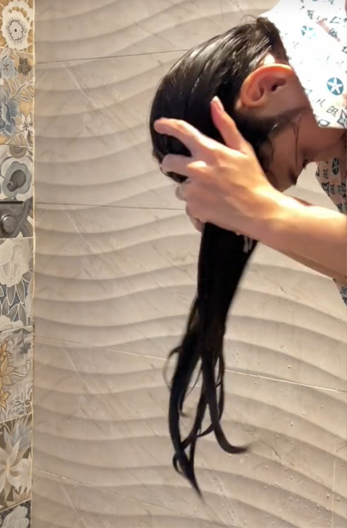 Tiếp đến là bước gội đầu để xả sạch dung dịch ủ tóc. Kinh nghiệm của nàng hậu là nên dùng dầu gội, dầu xả có thành phần tự nhiên sẽ giúp dưỡng tóc tốt hơn. Đỗ Thị Hà cũng không sấy khô ngay sau khi gội sạch, mà quấn khăn cho hút hết nước trong tóc, giúp tóc khô tự nhiên.