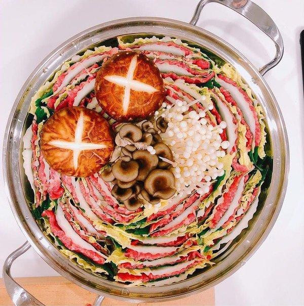 Khâu mất thời gian nhất chính là bạn hãy xếp từng lớp rau cải thảo, rồi lại từng lớp thịt bò xung quanh nồi để tạo thành bông hoa khổng lồ. Phần nấm sẽ dùng để làm nhụy hoa. Sau khi chụp ảnh từ 7749 góc, để người khác trầm trồ khen ngợi chán chê rồi mới đổ nước lẩu vào đun sôi và ăn.