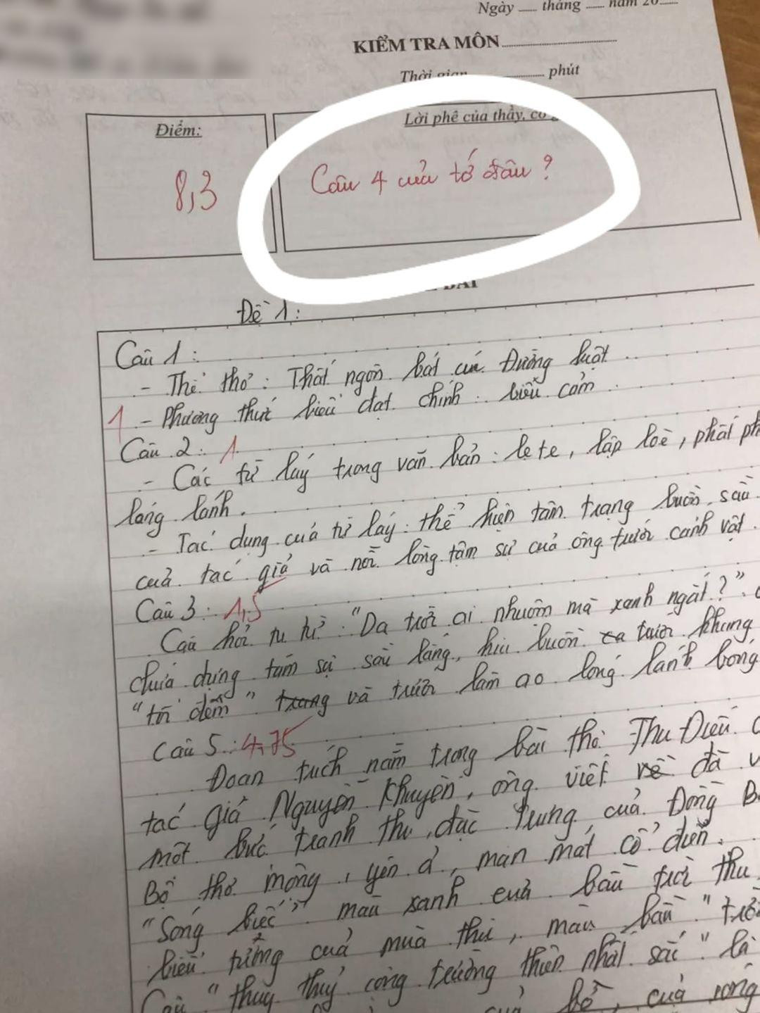 Mới đây, một bài kiểm tra môn Ngữ Văn của học sinh được chia sẻ rầm rộ trên mạng xã hội. Bài kiểm tra được điểm khá cao là 8,3 điểm. Tuy nhiên, bạn học sinh này lại làm thiếu một câu. Chuyện sẽ chẳng có gì đến khi nhìn sang lời phê của giáo viên. Thay vì nhận xét khô khan, cô giáo đã xưng bạn - tớ với học sinh. Cụ thể, cô giáo phê rằng: "Câu 4 của tớ đâu?".
