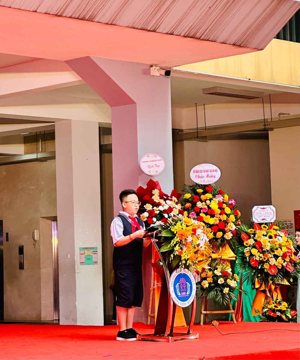 Bạn Nguyễn Hùng Minh, học sinh lớp 6A4 đại diện học sinh Khối 6 phát biểu cảm xúc khi lần đầu tiên trở thành học sinh của trường THCS Ngô Sĩ Liên. Hùng Minh là học sinh có thành tích học tập vô cùng xuất sắc với 34 giải Toán gồm 16 giải quốc tế và 18 giải quốc gia, trong đó có 5 Huy chương Vàng quốc tế và 5 Huy chương Vàng quốc gia.