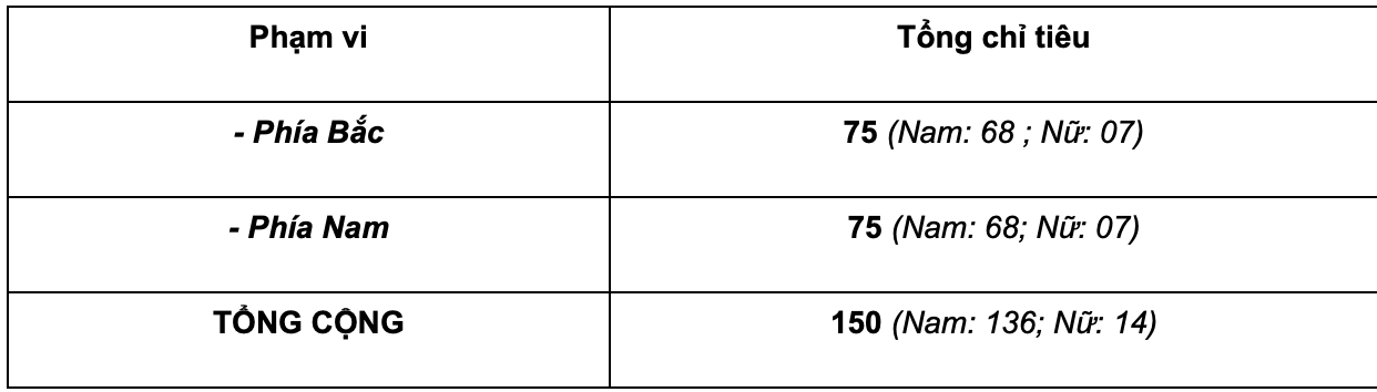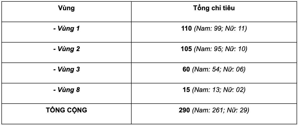 Tổng chỉ tiêu tuyển sinh là 440 chỉ tiêu; phân chia theo các vùng, các ngành như sau:
