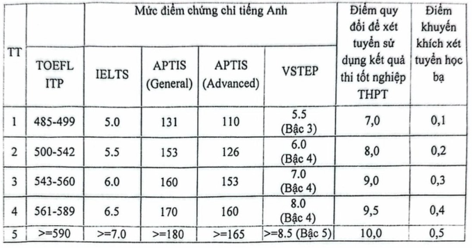 Ngoài xét tổng điểm ba môn theo tổ hợp, trường cho phép học sinh quy đổi điểm chứng chỉ thay thế điểm của môn tiếng Anh trong tổ hợp.