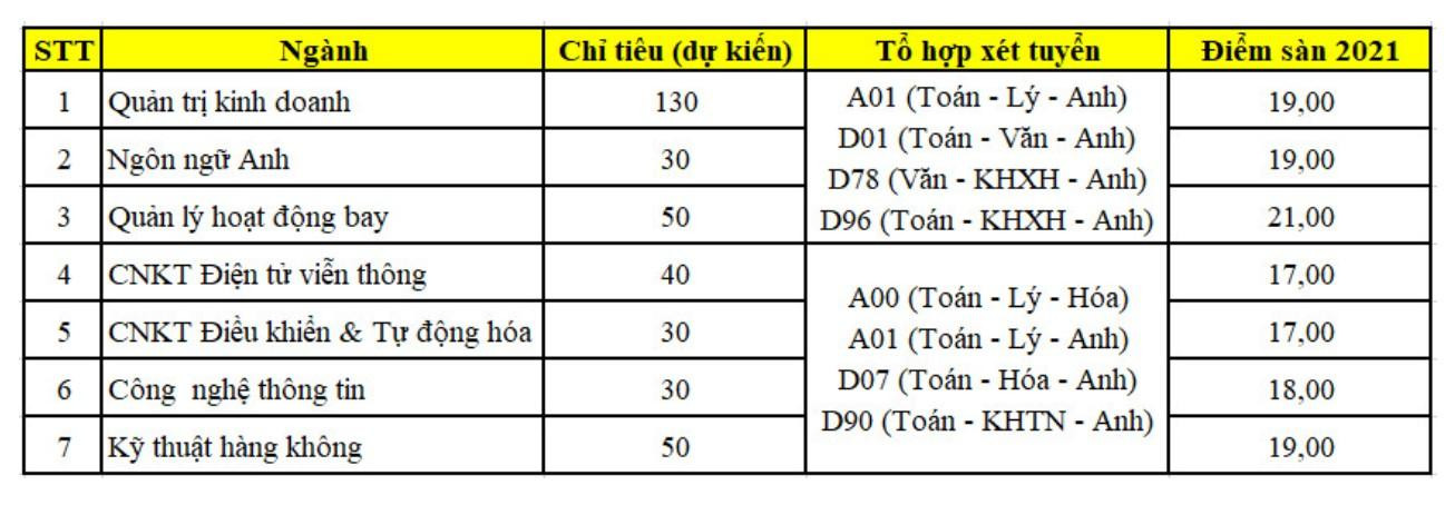 Học viện Hàng không Việt Nam công bố ngưỡng đảm bảo chất lượng đầu vào (điểm sàn) theo kết quả thi tốt nghiệp THPT năm 2021 từ 17 đến 21 điểm. Cụ thể: