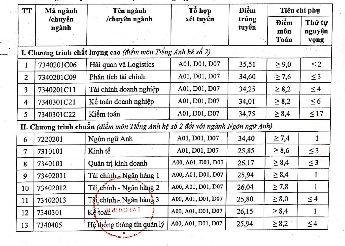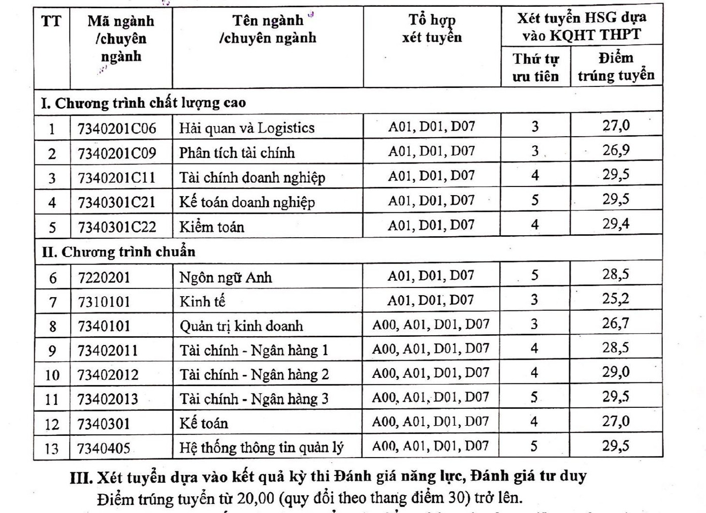 Còn ở phương thức xét kết quả học bạ, điểm chuẩn cao nhất 29,5/30 điểm đối với 4 ngành Tài chính doanh nghiệp, Kế toán doanh nghiệp, Hệ thống thông tin quản lý, Tài chính Ngân hàng 3.