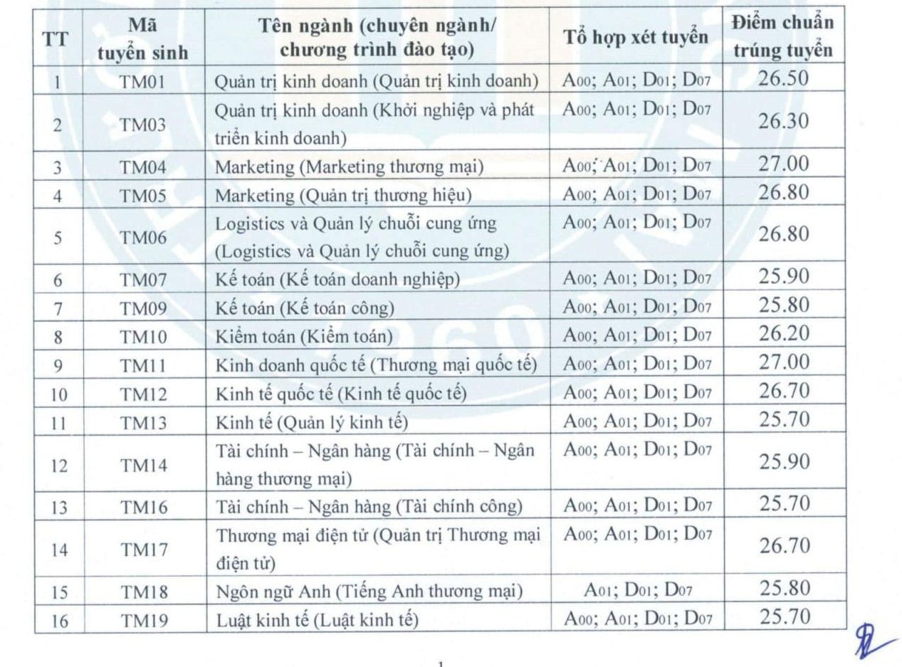 Điểm chuẩn Trường ĐH Thương mại như sau: