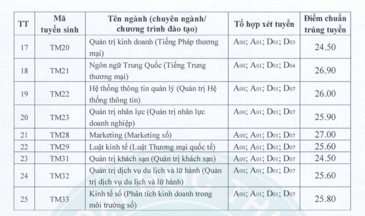 Trường ĐH Thương mại có 3 ngành điểm chuẩn cao nhất 27 điểm là Marketing (chuyên ngành Marketing số), Kinh doanh Quốc tế và Marketing (chuyên ngành Marketing thương mại).