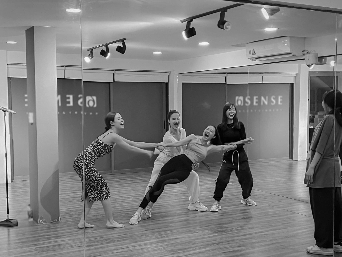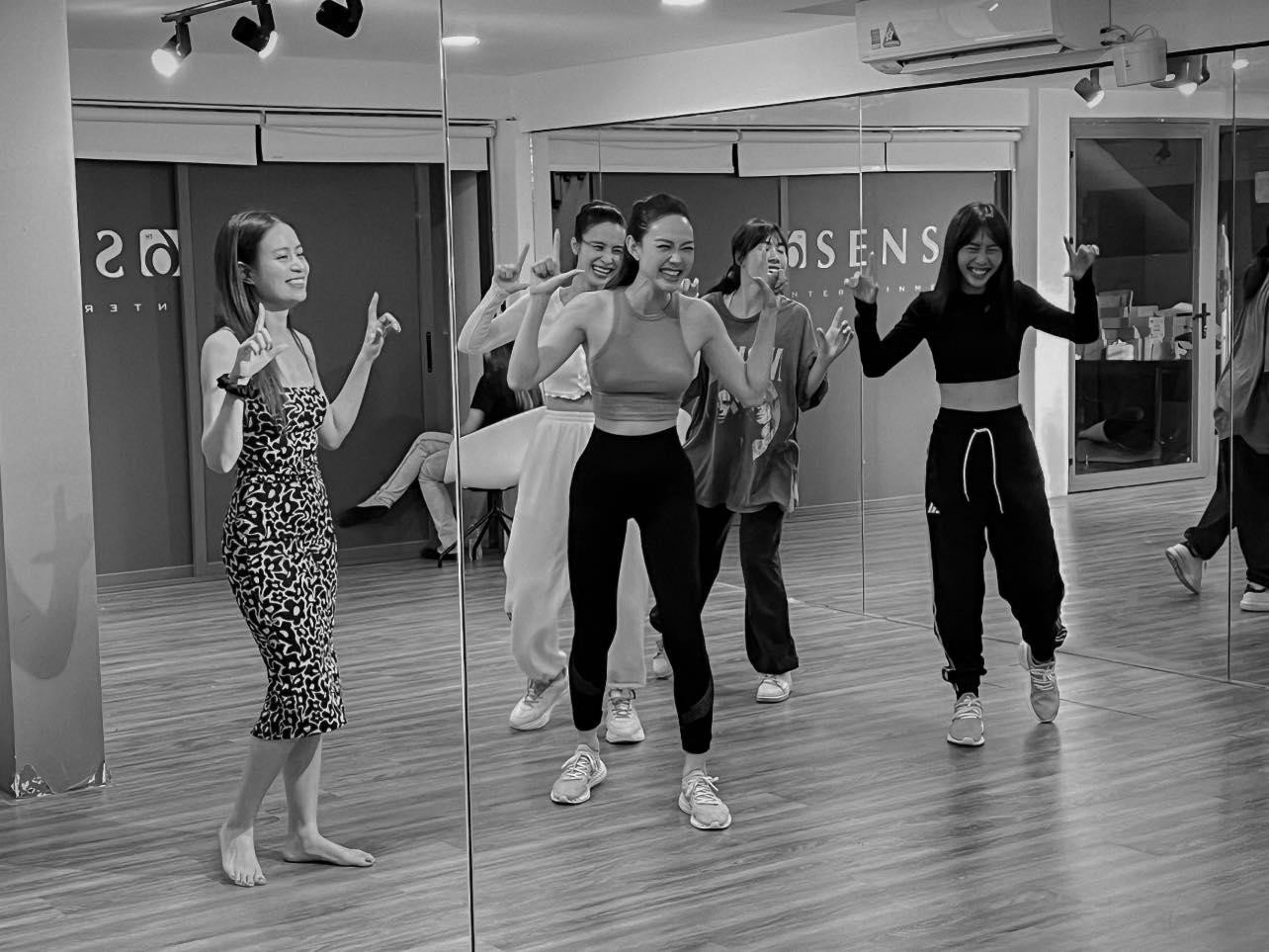 Trong ảnh, Minh Hằng cùng loạt 'mỹ nhân' V-pop đình đám Đông Nhi, Hoàng Thùy Linh và nữ diễn viên Khả Ngân tập trung học theo từng động tác từ biên đạo Lan Nhi. Bên cạnh hàng loạt khoảnh khắc chăm chỉ là những phút giây thư giãn, vui cười thoải mái của nhóm 'người đẹp' trên phòng tập.