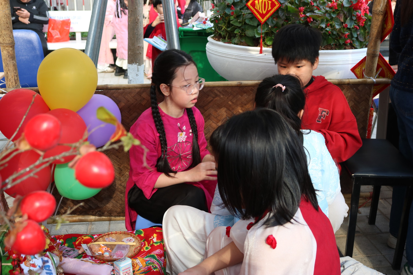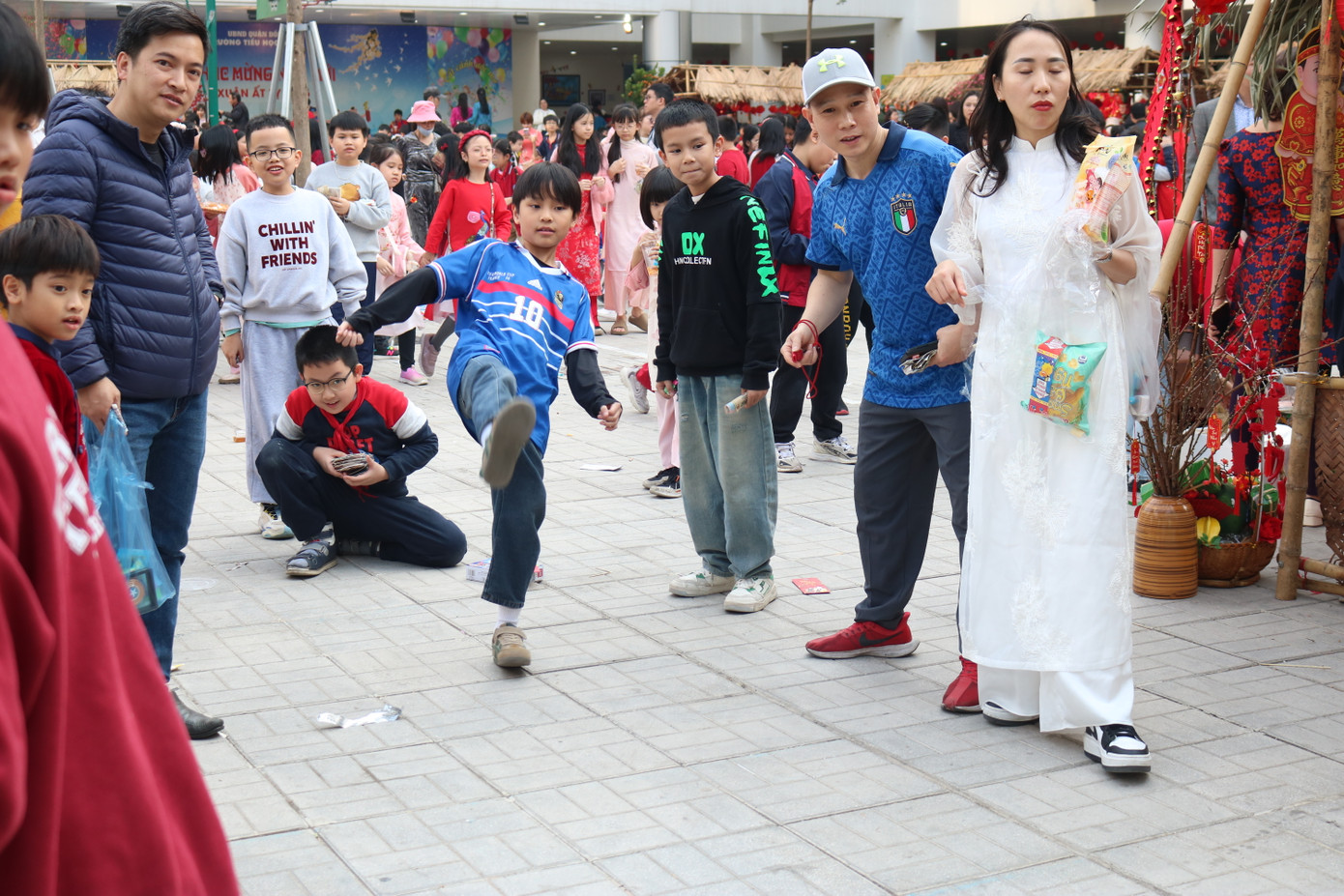 Chiều 16/1, Hội chợ Xuân của trường Tiểu học Đống Đa chính thức mở cửa. Sân trường được phủ kín và "tô màu" bởi muôn sắc từ áo dài của các bạn học sinh. Bao quanh sân trường là gian hàng từ các lớp mà chủ tiệm là thầy cô, phụ huynh hoặc chính các tween.