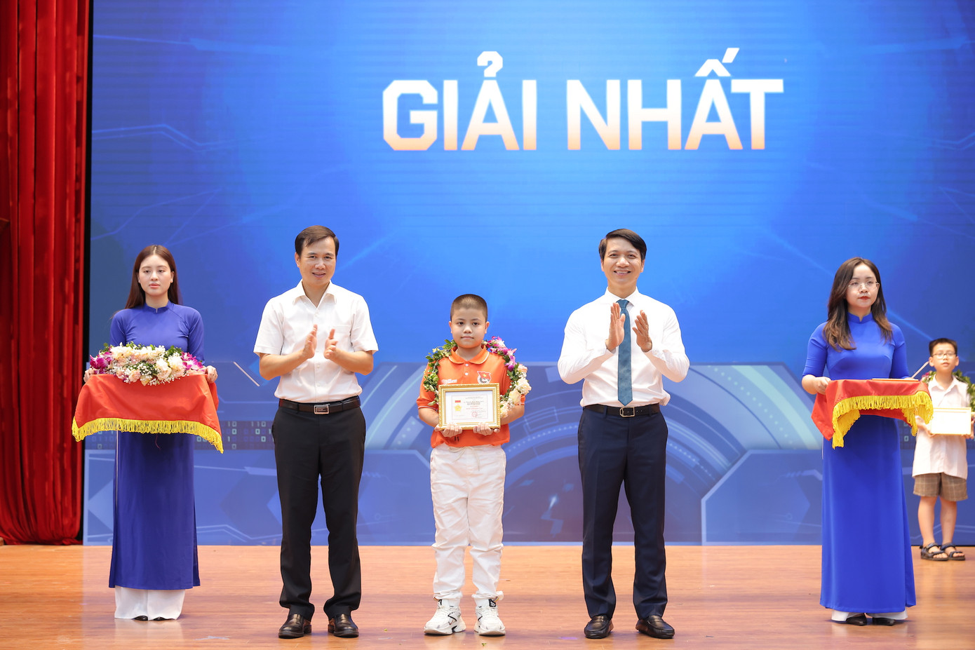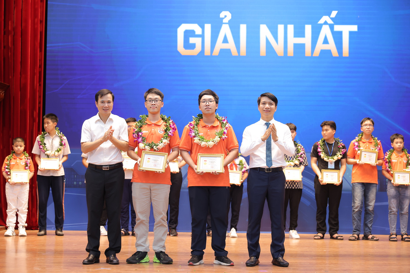 | Thứ trưởng Bộ KH&CN Bùi Thế Duy và Bí thư thường trực T.Ư Đoàn, Chủ tịch T.Ư Hội LHTN Việt Nam Nguyễn Ngọc Lương, trao giải Nhất cho các thí sinh, nhóm thí sinh. |