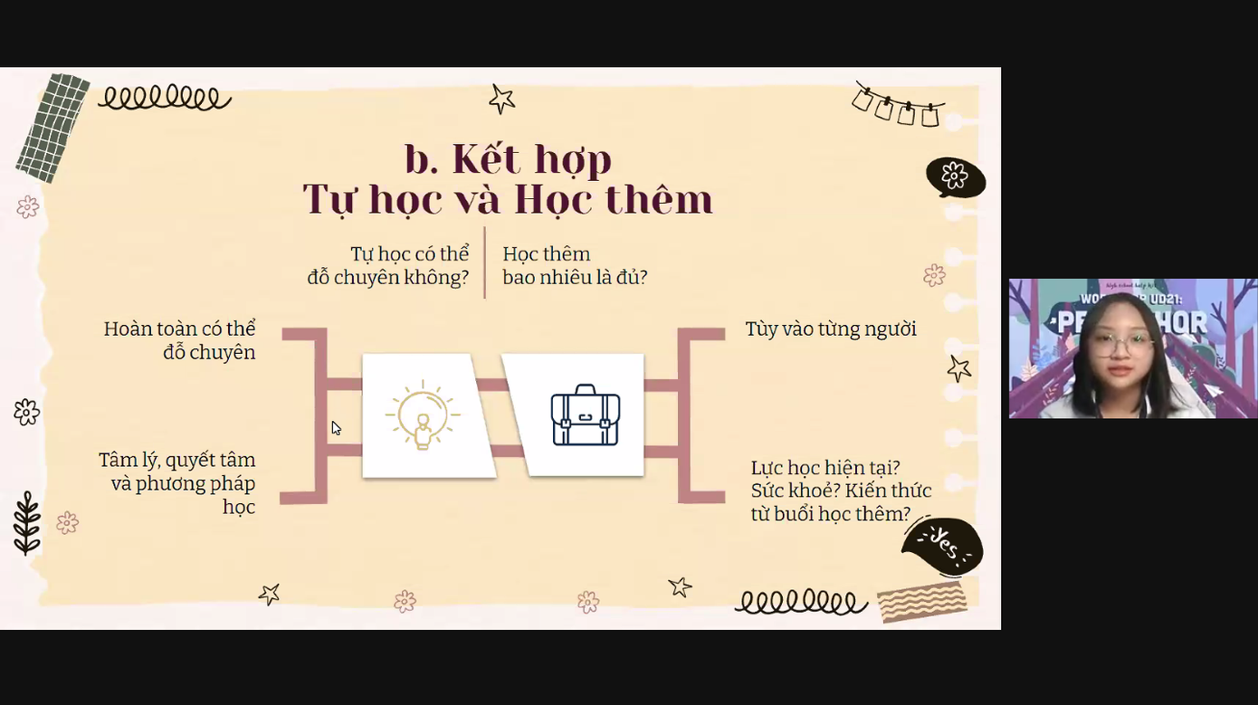 “Chúng mình đặt ra thứ tự ưu tiên của các môn học và lập thời gian biểu hàng tuần, lộ trình học từng môn. Ngoài ra, cũng cần lưu ý là giờ nào việc nấy, không để thời gian học các môn lẫn lộn để có thể tiết kiệm thời gian và học tập hiệu quả nhất.” - bạn Trần Thị Khánh Linh, diễn giả chương trình chia sẻ.