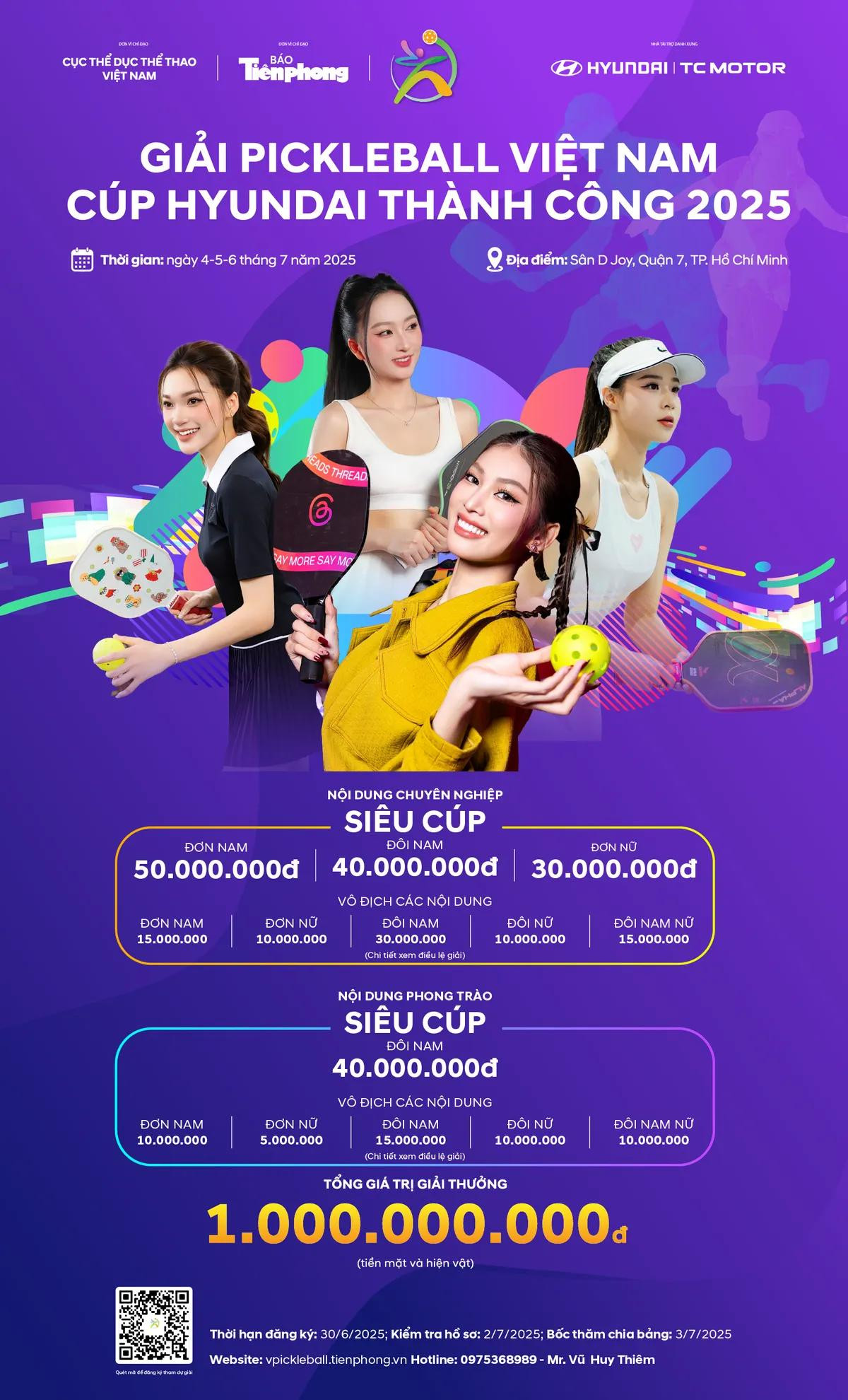 Giải Vô địch Pickleball Việt Nam 2025 – Cúp Hyundai Thành Công, do Báo Tiền Phong phối hợp cùng Cục Thể dục Thể thao Việt Nam tổ chức, chính thức khởi tranh từ ngày 4- 6/7/2025 tại cụm sân D-JOY (Quận 7, TP.HCM).