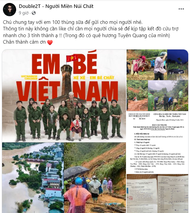 Rapper Double2T kêu gọi mọi người cùng góp thêm lương thực như mì tôm, xúc xích, sữa cho chuyến xe cứu trợ đến 3 tỉnh thành Tuyên Quang - Cao Bằng - Bắc Kạn.