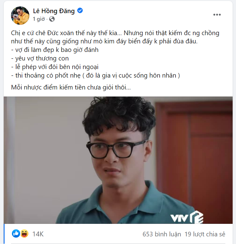 Mới đây, để đòi lại công bằng cho vai diễn Đức "xoăn" của mình, Hồng Đăng đã đăng trên trang cá nhân một loạt điểm tốt của nhân vật khiến khán giả thích thú. Cụ thể, nam diễn viên hài hước viết: