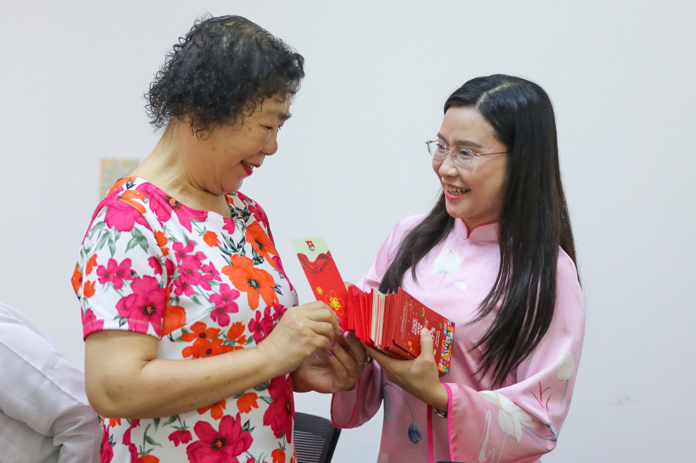 | Chị Nguyễn Phạm Duy Trang - Bí thư T.Ư Đoàn mừng tuổi đầu Xuân cho cựu cán bộ Đoàn qua các thời kỳ. (Ảnh: Duy Anh) |