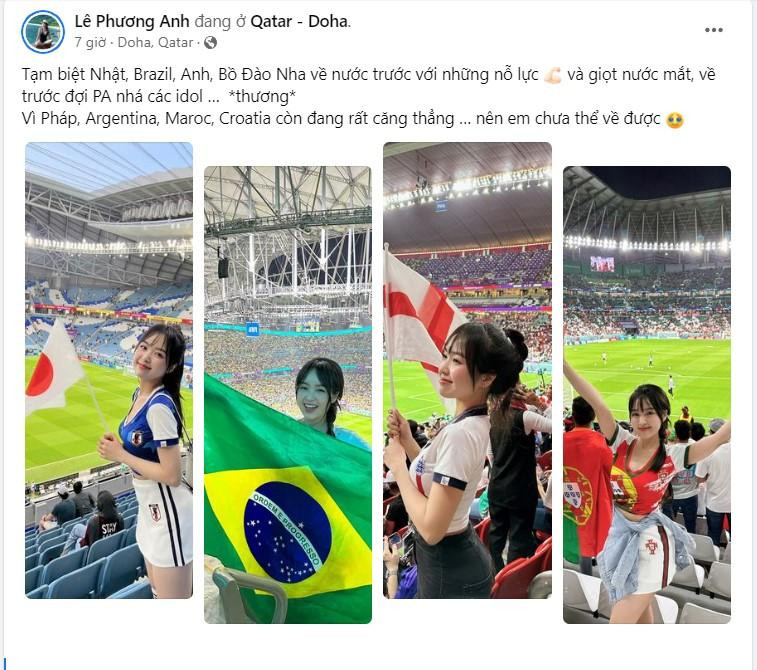 Rất nhiều người hâm mộ trên khắp thế giới đổ về Qatar để theo dõi World Cup 2022, trong đó có hot girl Lê Phương Anh từ Việt Nam. Cô nàng đã có mặt trên khán đài để xem trực tiếp các trận đấu tứ kết hấp dẫn.