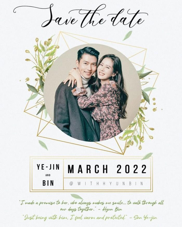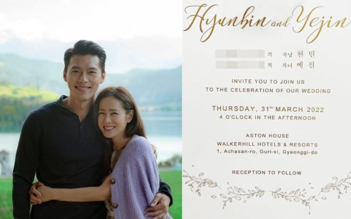 Theo thiệp mời đám cưới của Hyun Bin và Son Ye Jin được Ilgan Sports đưa ra vào ngày hôm nay, cả hai sẽ có buổi lễ vào 4h chiều ngày 31/3 (ban đầu bị hiểu nhầm là lúc 11h trưa). Vì là 'đám cưới thế kỷ' đang được dư luận quan tâm nên nhiều thông tin cho rằng Hyun Bin và Son Ye Jin đã yêu cầu các khách mời nhận thiệp cưới giữ kín thông tin cụ thể về đám cưới.