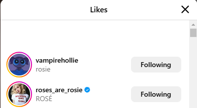 Đó là cô bé Kong A Yun, sở hữu tài khoản Instagram hiện có hơn 1 triệu lượt theo dõi là a_yun_daily. Video đầu tiên mà Rosé "thả tim" cho A Yun là chiếc clip cô bé mặc bộ bodysuit màu hồng, nhảy theo nền nhạc APT. Nữ ca sĩ nhấn thích bằng tài khoản phụ vampirehollie - nick Instagram cô mới tiết lộ vào tháng 9, nơi Rosé cập nhật thông tin về các hoạt động sản xuất âm nhạc của cô.
