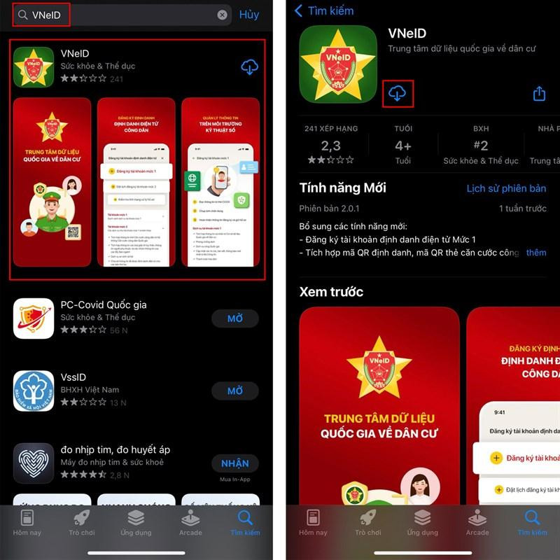 Bước 1: Các bạn lên App Store hoặc Google Play và nhập từ khóa VNeID > Tải về.