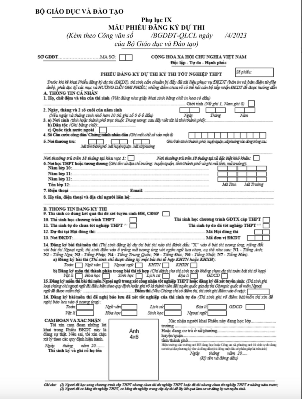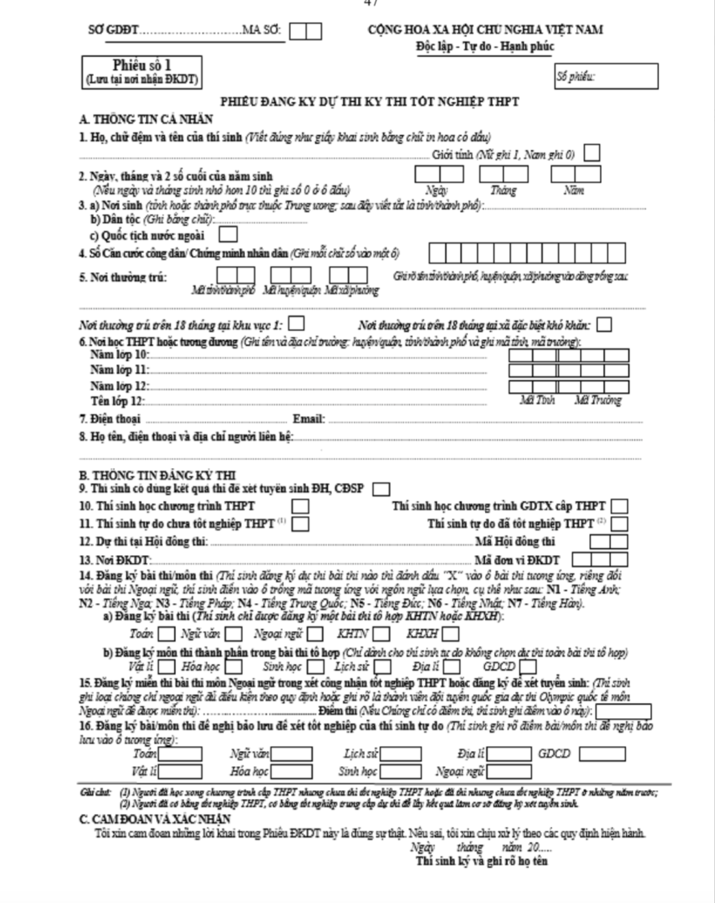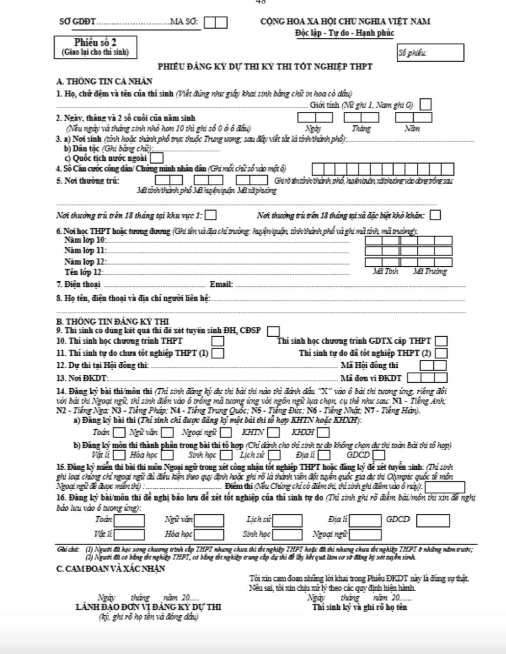 Mục 1, 2: Ghi theo hướng dẫn trên phiếu đăng ký dự thi kỳ thi tốt nghiệp THPT.