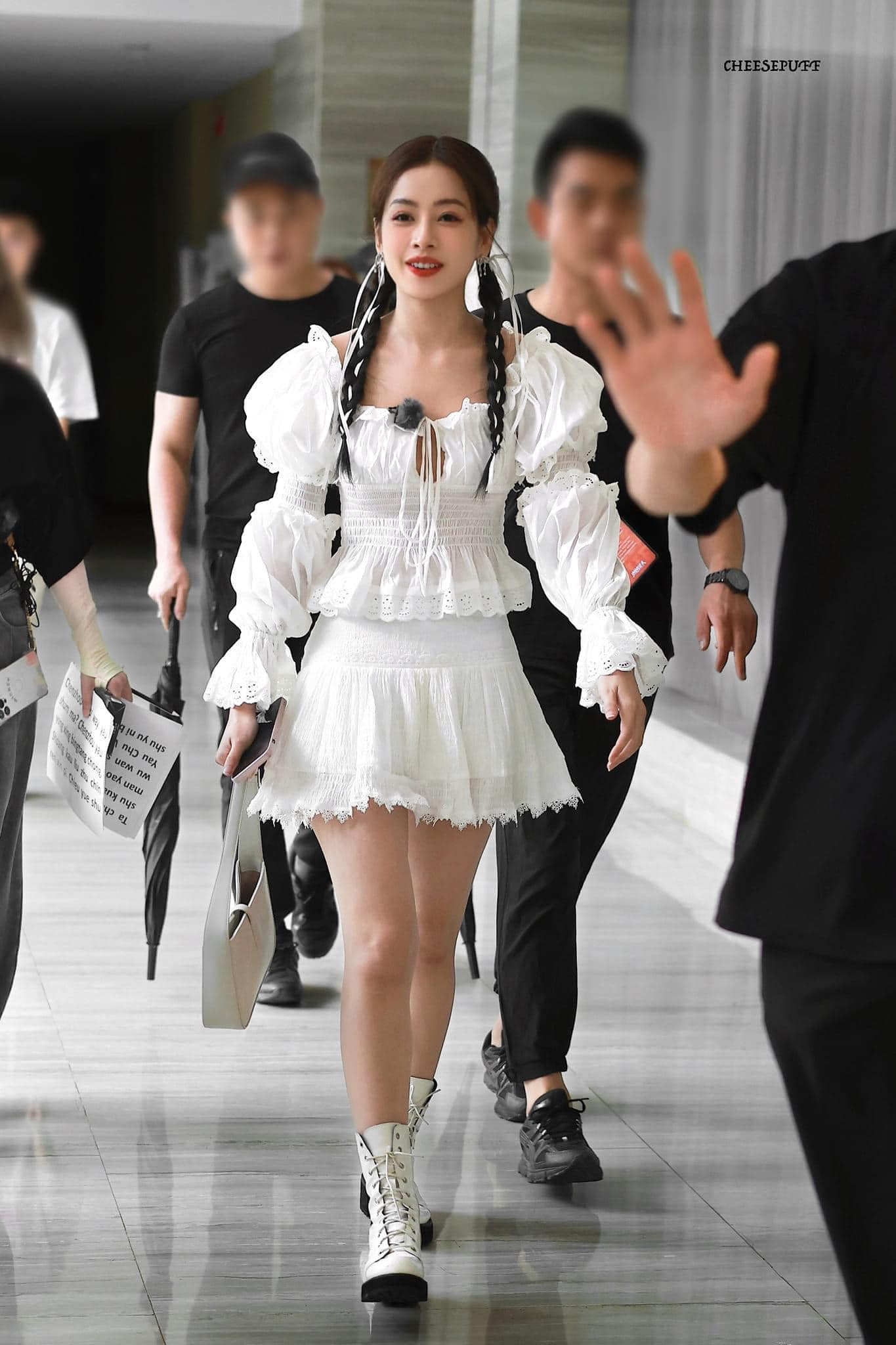 Trong bức ảnh được trạm tỷ chụp lại khi trên đường xuất, người hâm mộ chú ý đến các mảnh giấy mà nhân viên đi theo Chi Pu đang cầm. Dựa vào chữ viết thì đoán rằng đây là phiên âm tiếng Trung và có lẽ là "phao cứu sinh" của Chi Pu trong một đoạn phát biểu nào đó.