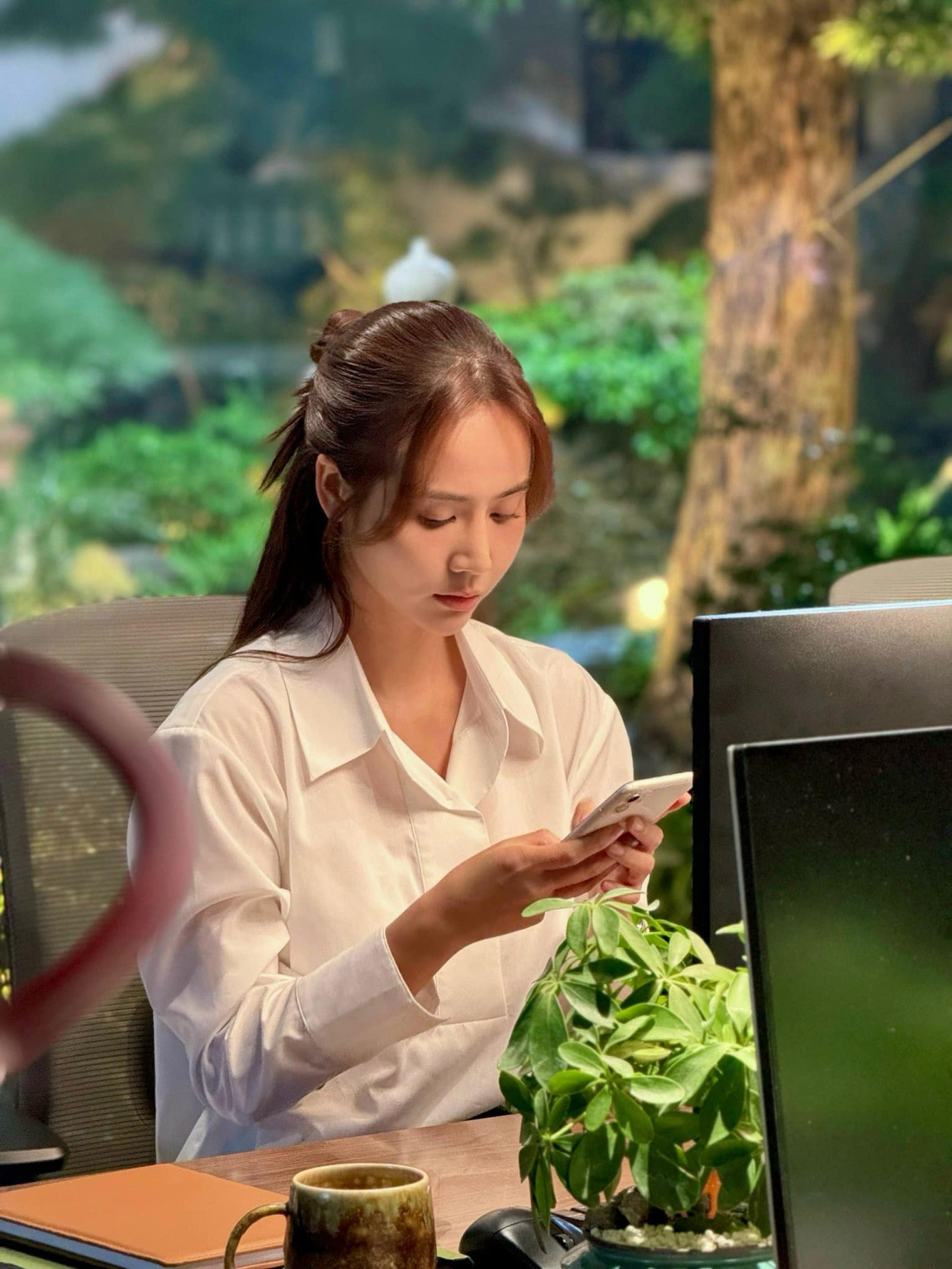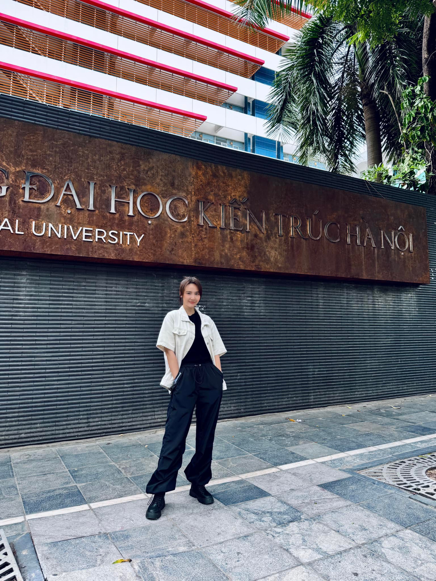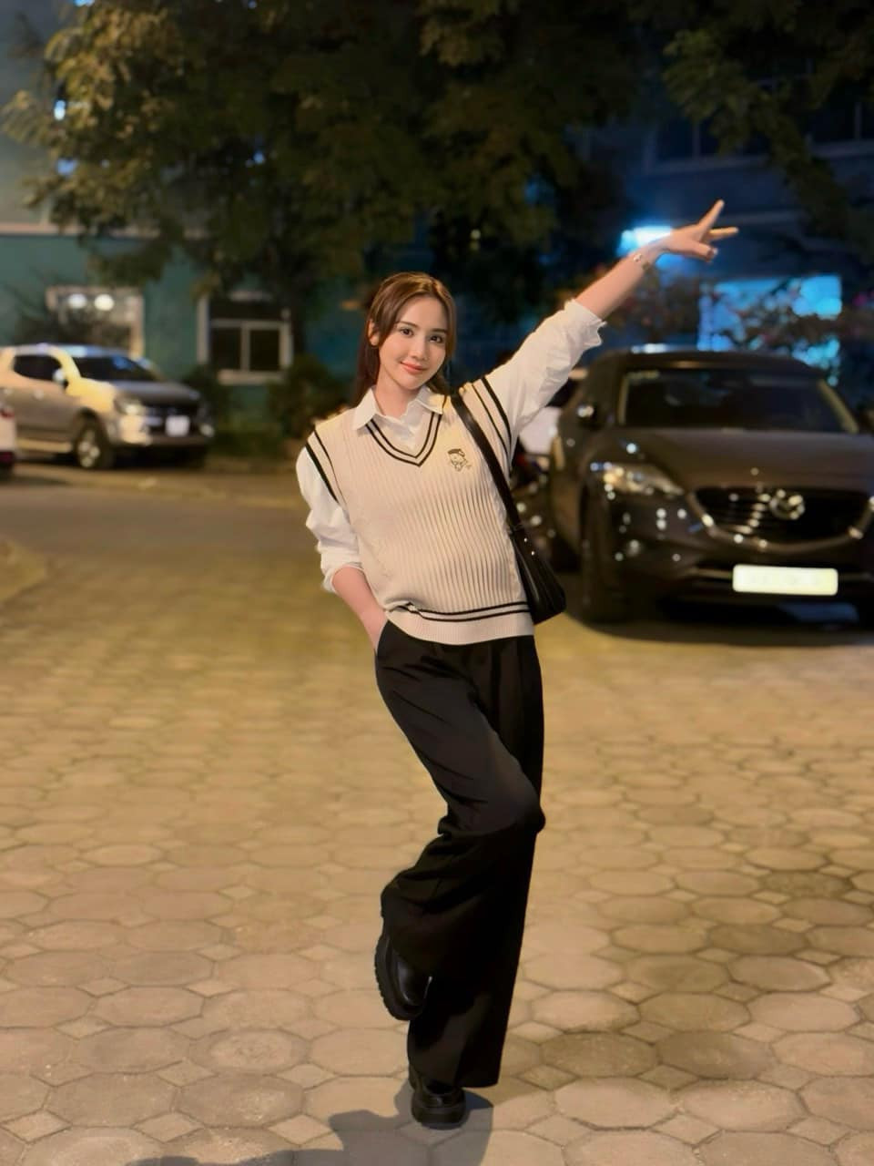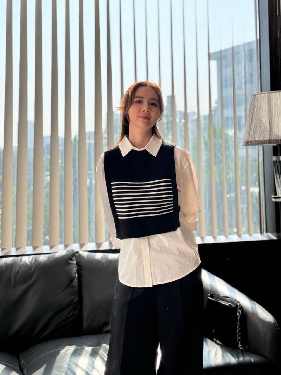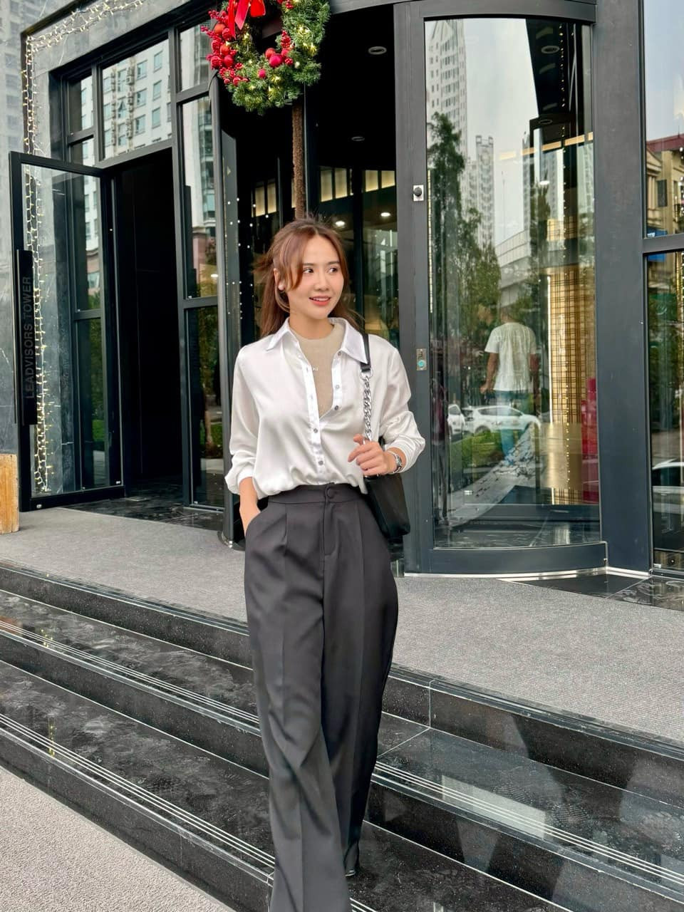 Hoặc cũng là mặc sơ mi trắng, nhưng Huyền Lizzie thêm áo gile lửng bên ngoài là đã có ngay công thức phối đồ rất thú vị, toàn món cơ bản nhưng khi kết hợp với nhau lại cho ra tổng thể đẹp mắt.