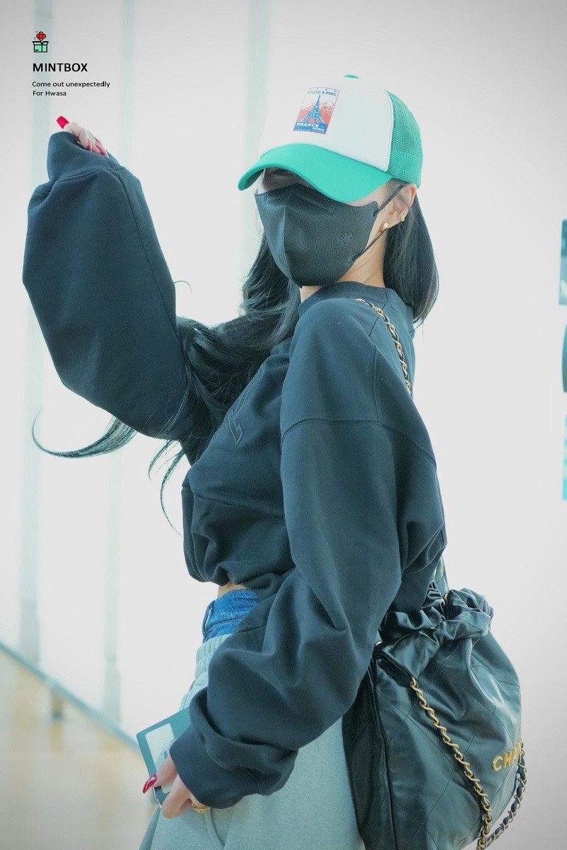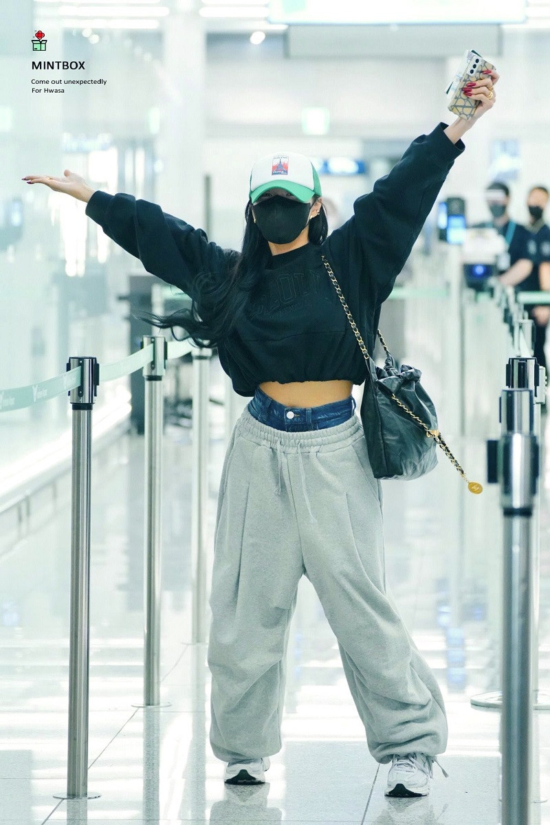 Khi Hwasa đến, nữ ca sĩ ngay lập tức bộc lộ tính cách thân thiện khi vẫy tay và còn tạo dáng dễ thương với báo giới và người hâm mộ. Ngoài thần thái sang chảnh, nữ ca sĩ của ca khúc Maria còn được các phóng viên đặc biệt săn đón với gu thời trang sân bay mới lạ. Hwasa đội một chiếc mũ lưỡi trai màu xanh lá cây, kết hợp với áo len đen và quần thể thao màu xám.