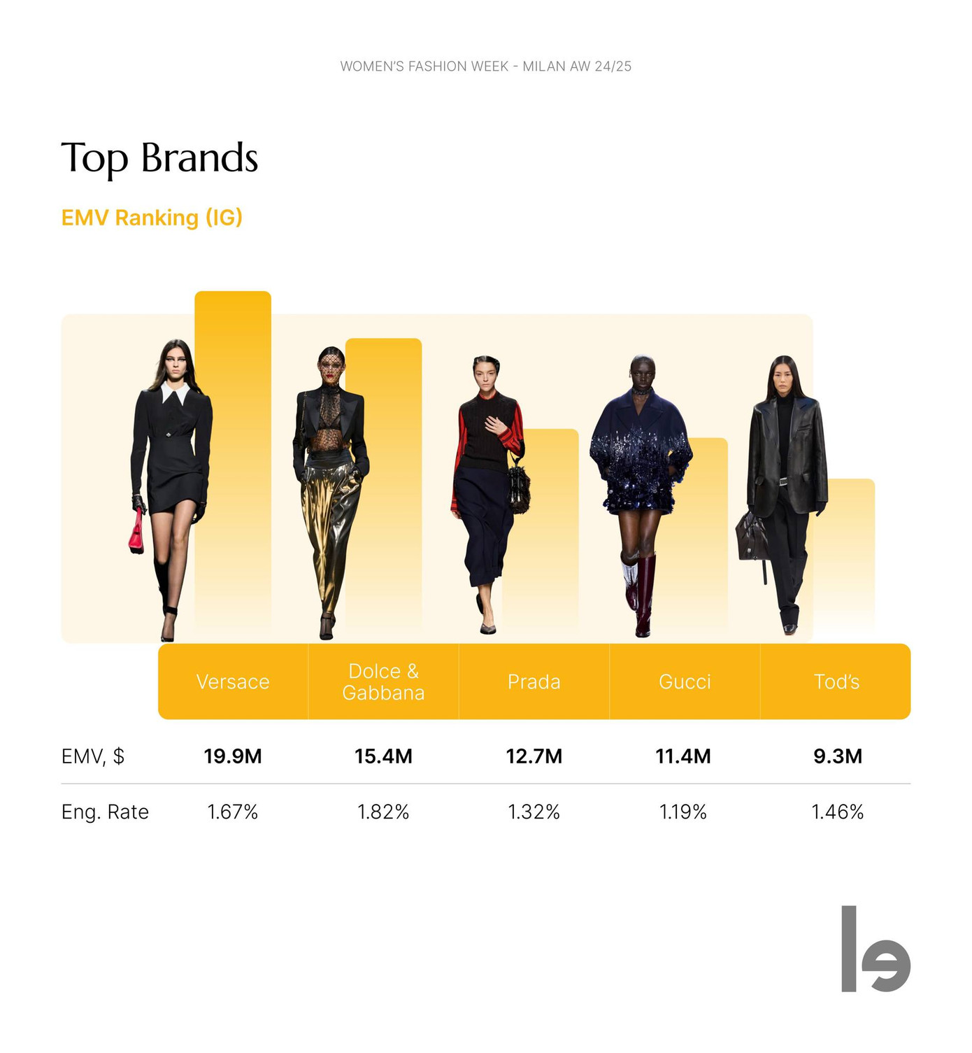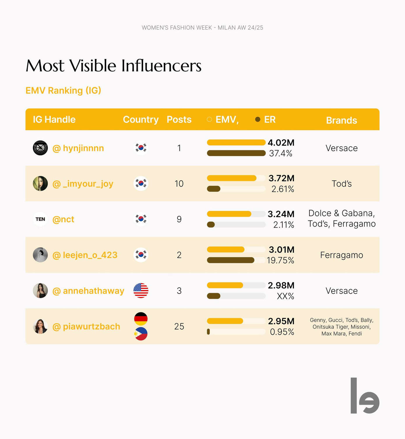 Báo cáo từ Lefty cho biết Hyunjin Stray Kids dẫn đầu bảng tổng kết chỉ số EMV tại Milan Fashion Week 2024. Mỹ nam xuất hiện với vai trò là đại sứ toàn cầu của thương hiệu Versace. Anh góp phần tạo ra 4,02 triệu USD (khoảng 98 tỷ đồng) với tỷ lệ tương tác 37,4% chỉ với một bài đăng duy nhất trên Instagram.