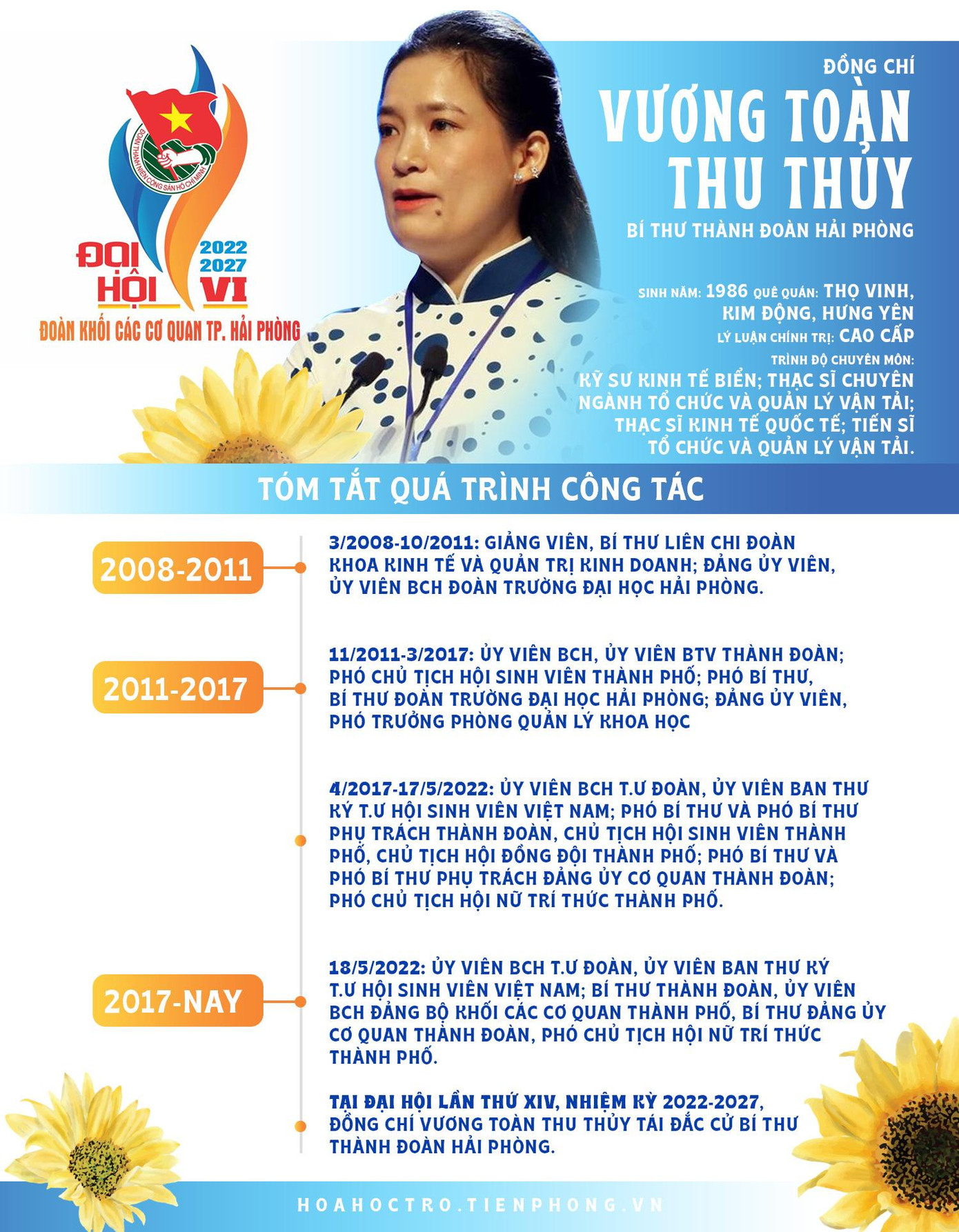 Đồng chí Vương Toàn Thu Thủy - Bí thư Thành Đoàn Hải Phòng khóa XIII, tái đắc cử Bí thư Thành Đoàn Hải Phòng khóa XIV, nhiệm kỳ 2022 - 2027 với 100% phiếu bầu đồng ý. Hội nghị lần thứ nhất BCH Đoàn TNCS Hồ Chí Minh TP. Hải Phòng khóa XIV, nhiệm kỳ 2022 - 2027 đã bầu Ban Thường vụ, Bí thư, các Phó Bí thư... nhiệm kỳ mới.