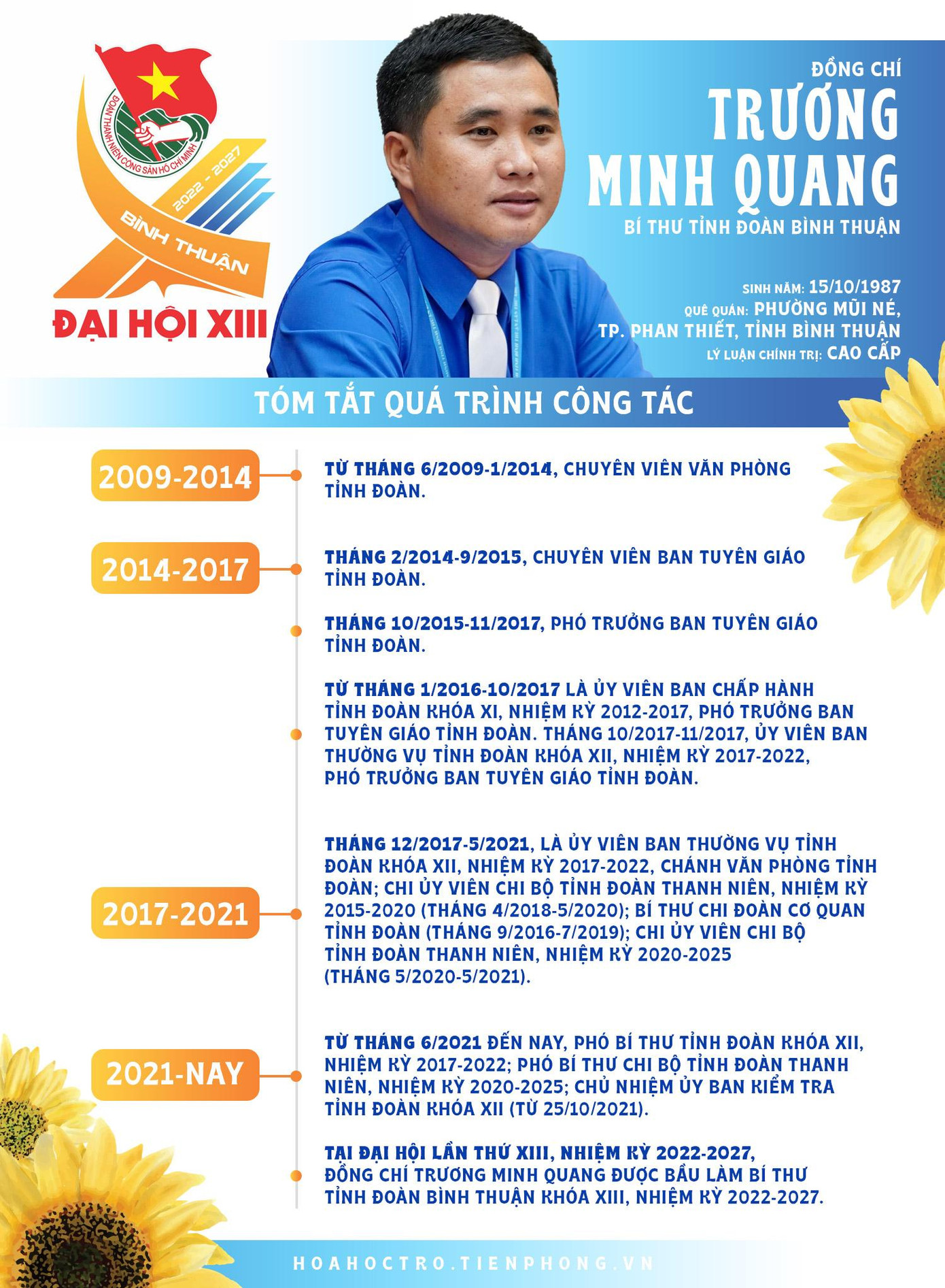 Đại hội đại biểu Đoàn TNCS Hồ Chí Minh tỉnh Bình Thuận khóa XIII, nhiệm kỳ 2022-2027 đã bầu ra Ban Chấp hành khóa mới gồm 37 đồng chí. Đồng chí Trương Minh Quang, Phó Bí thư Tỉnh Đoàn Bình Thuận khóa XII đã được bầu làm Bí thư Tỉnh Đoàn Bình Thuận khóa XIII, nhiệm kỳ 2022 - 2027.
