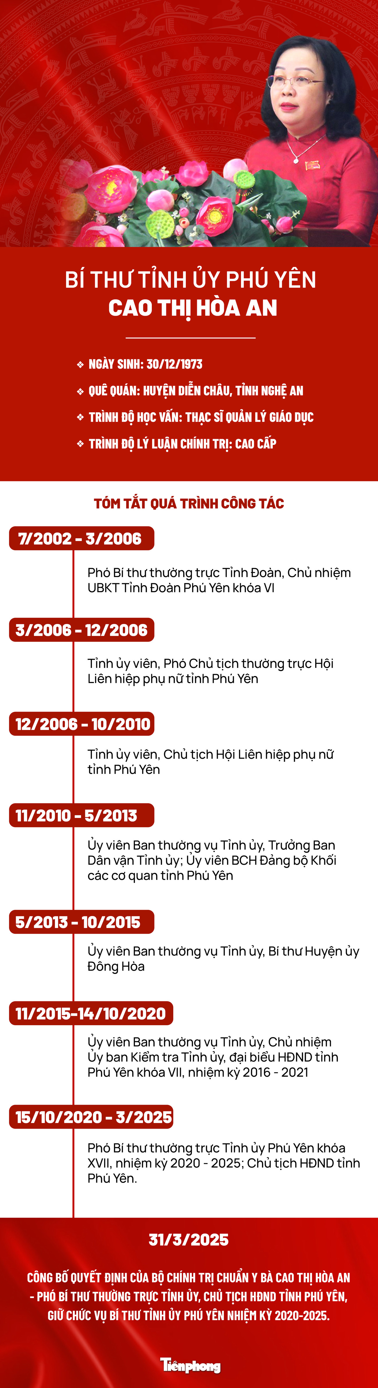 TPO - Bộ Chính trị chuẩn y bà Cao Thị Hòa An - Phó Bí thư Thường trực Tỉnh ủy, Chủ tịch HĐND tỉnh Phú Yên, giữ chức vụ Bí thư Tỉnh ủy Phú Yên nhiệm kỳ 2020-2025.