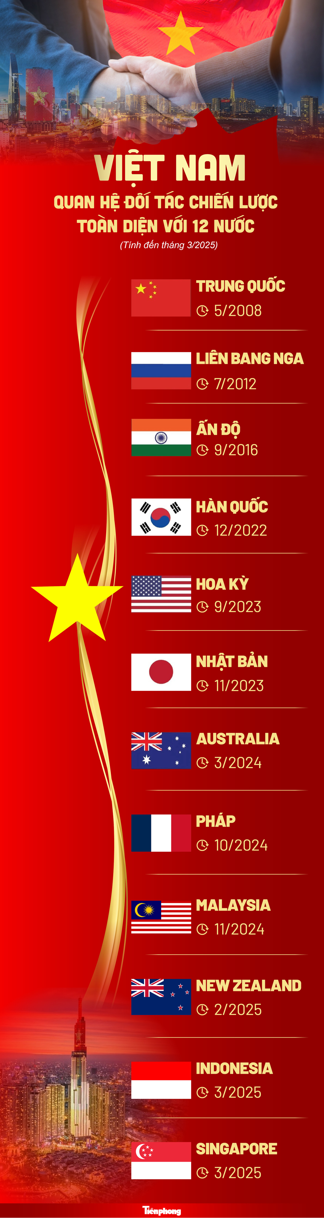 TPO - Tính đến ngày 12/3/2025, Việt Nam có quan hệ Đối tác Chiến lược Toàn diện với 12 quốc gia. Đó là: Trung Quốc (thiết lập quan hệ Đối tác Chiến lược Toàn diện vào tháng 5/2008), Liên bang Nga (7/2012), Ấn Độ (9/2016), Hàn Quốc (12/2022), Mỹ (9/2023), Nhật Bản (11/2023), Australia (3/2024), Pháp (10/2024), Malaysia (11/2024), New Zealand (2/2025), Indonesia (3/2025) và Singapore (3/2025).