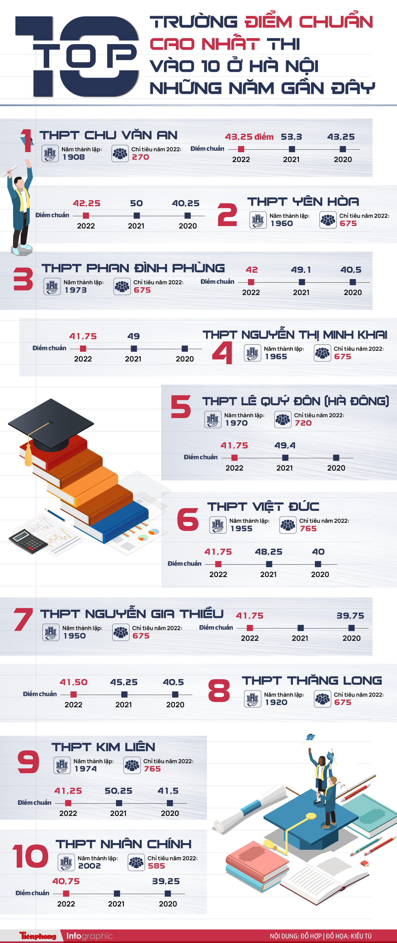 TPO - Cuộc đua tranh suất vào lớp 10 công lập hằng năm ở Hà Nội luôn luôn nóng. THPT Chu Văn An vẫn là ngôi trường lấy điểm chuẩn cao nhất. Dưới đây là top các trường THPT công lập có điểm chuẩn vào lớp 10 cao nhất tại Hà Nội trong những năm gần đây.