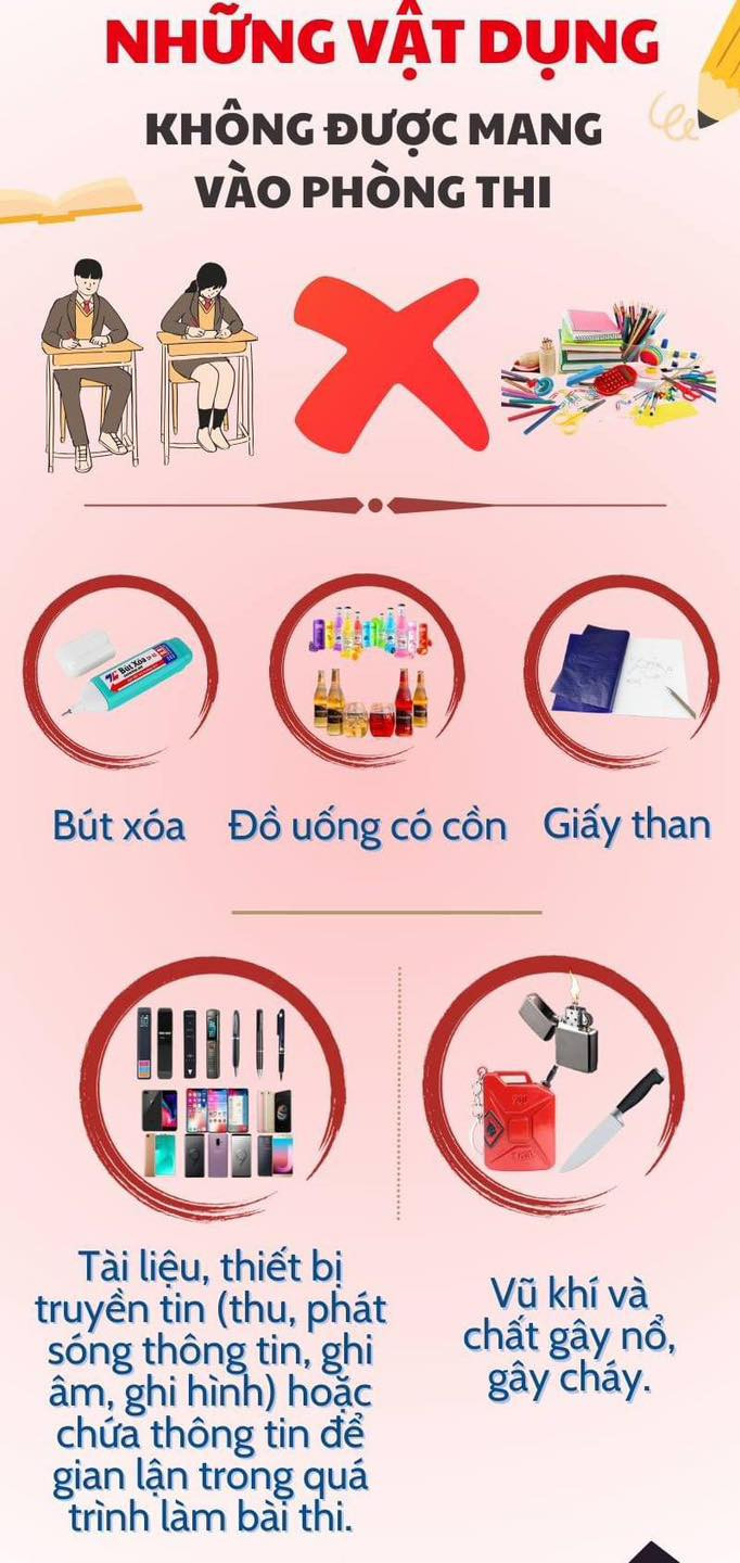 SVO - Chỉ còn vài ngày nữa, kỳ thi tốt nghiệp THPT năm 2024 sẽ diễn ra, để có một kỳ thi 'An toàn - Nghiêm túc - Đúng quy chế', ngoài việc trang bị đầy đủ kiến thức và sức khỏe, các thí sinh cần lưu ý những vật dụng không được mang vào phòng thi.